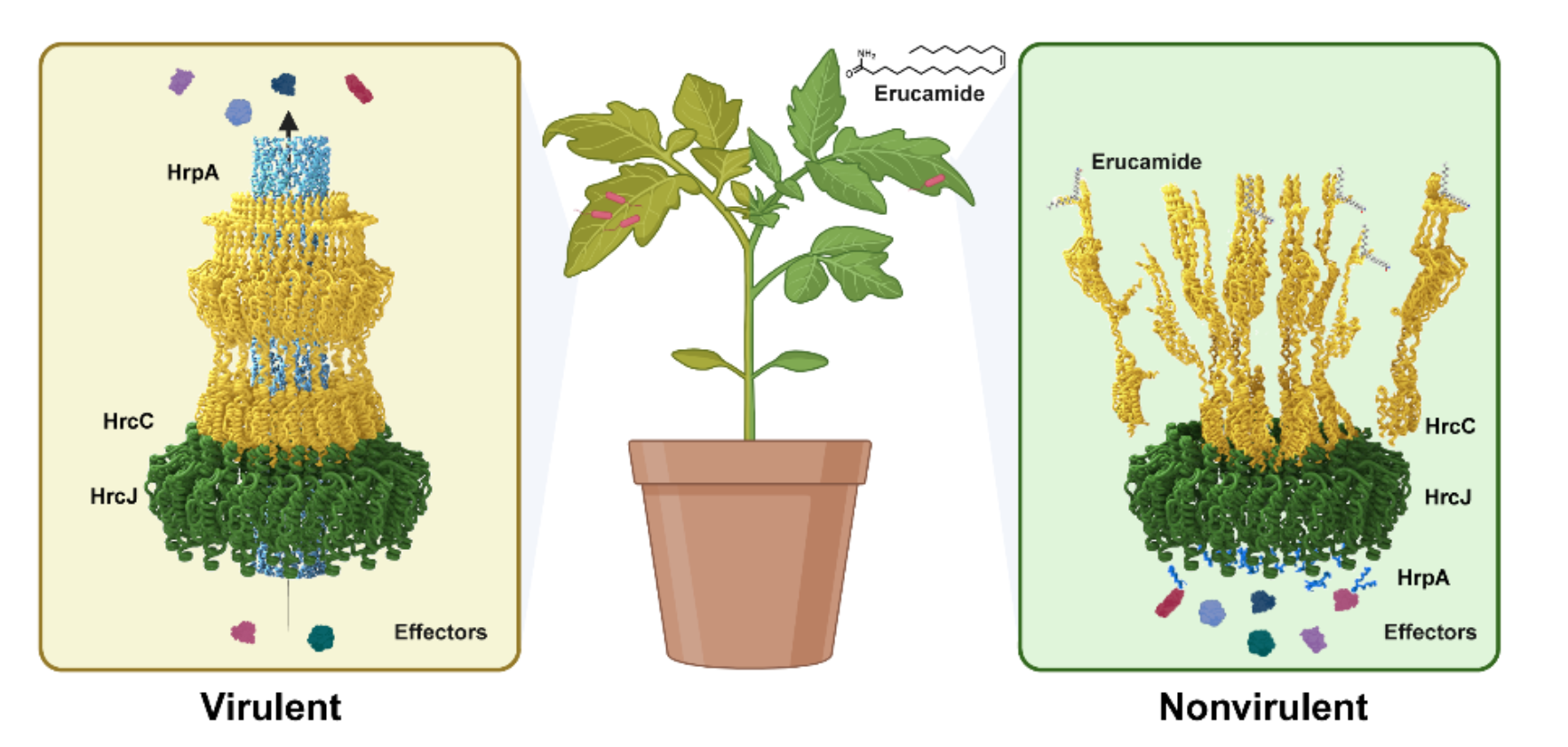 研究发现,芥酸酰胺能够靶向破坏病原细菌的关键致病装置——三型分泌系统(Type III secretion system, T3SS)。T3SS是许多动植物病原细菌用于向宿主细胞分泌毒性效应蛋白的核心装置,对细菌致病性至关重要。通过遗传学实验,研究团队证实芥酸酰胺的积累是植物实现对病原细菌免疫的关键机制。进一步的研究揭示,芥酸酰胺与T3SS的重要组分HrcC蛋白特异性结合,干扰其在病原细菌外膜上的正确定位,从而有效抑制T3SS的组装,使病原细菌失去致病能力。