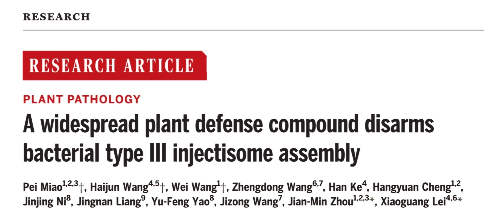 2025年2月28日,3003新葡官方网站/北大-清华生命联合中心雷晓光教授团队联合中国科学院遗传发育所/崖州湾国家实验室周俭民研究员团队在《科学》《Science》杂志上发表了题为“A widespread plant defense compound disarms bacterial type III injectisome assembly”的研究论文(Science 2025, 387, eads0377),首次揭示了一类植物内源存在的、具有作用机制独特、广谱抗菌活性的天然产物分子——芥酸酰胺。研究表明,芥酸酰胺通过特异性破坏植物病原细菌的三型分泌系统(T3SS)组装,有效抑制其致病力,从而实现对多种细菌侵染的广谱抑制作用。这一机制体现了"不战而屈人之兵"的创新抗菌策略,与传统抗生素药物相比具有显著优势:芥酸酰胺不直接杀灭细菌,而是选择性地降低病原菌的致病力,这种独特的作用模式不仅确保了更高的生物安全性,还显著减少了对环境的污染风险,同时有效规避了细菌耐药性的产生。这一重大科学发现为新型生物农药的研发开辟了全新路径,对推动绿色农业可持续发展具有重要的理论和实践意义。