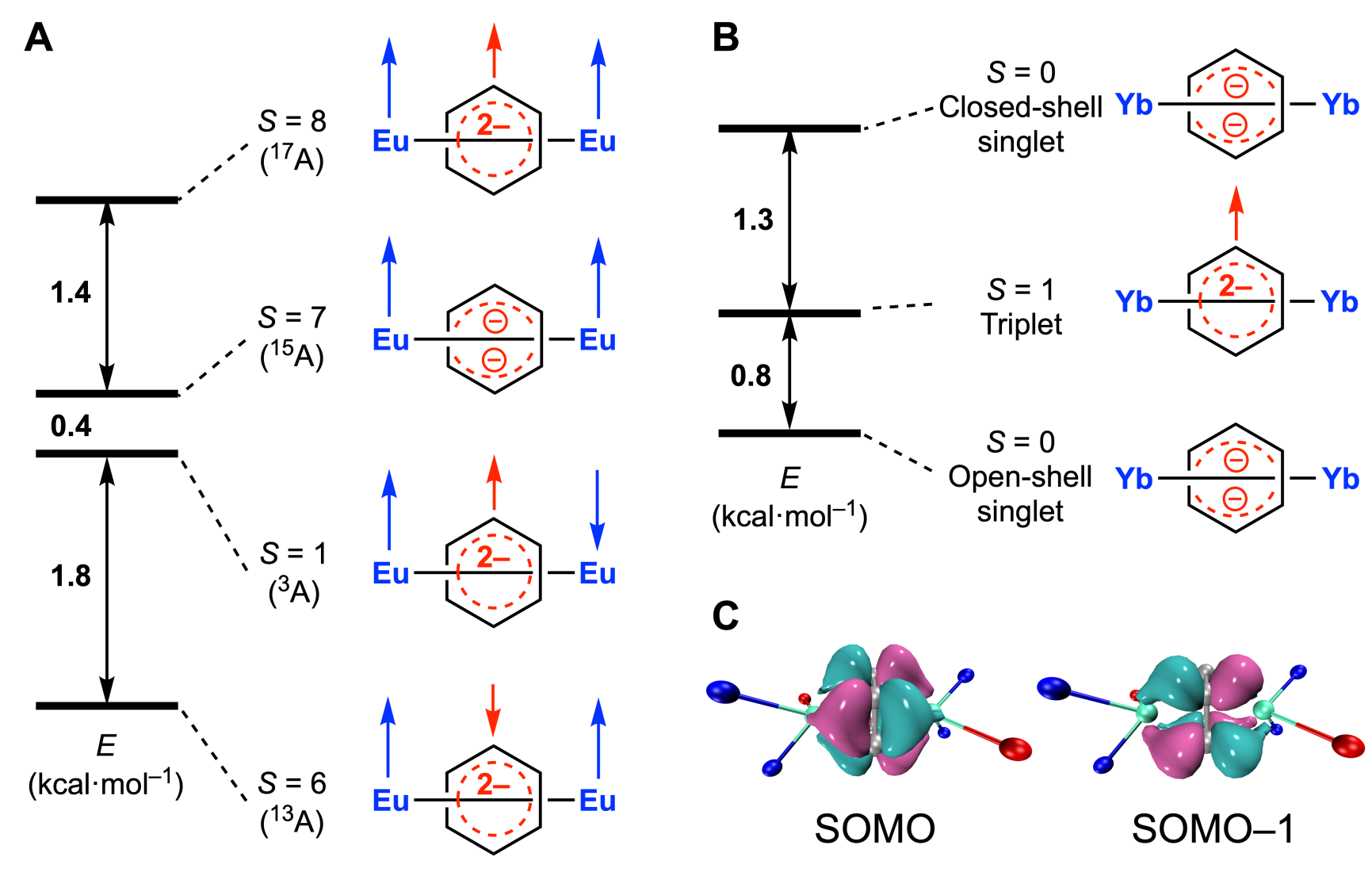 作者对这些配合物进行了全面的谱学和磁性表征来探究其电子结构。2-Yb、2-Eu和3-Eu戊烷溶液的吸收光谱均在500和700nm处有两个宽吸收带(ε~2000‒5000 M–1·cm–1)。EPR测试结果显示,2-Yb的基态为单重态,且存在能量上很接近的三重态激发态。磁性测试结果显示,在室温时,2-Eu的χmT值小于1-Eu和3-Eu,而后两者则相当于两个未耦合的Eu2+离子之和(图3A);在2 K时,2-Eu的磁化强度与两个Eu2+离子减去一个三重态苯二负离子的值相吻合(图3B)。若将2-Eu视为三中心自旋体系,用海森堡模型拟合得到苯二负离子与Eu2+间的磁耦合常数JEu–rad为–80 cm–1(图3C),而将2-Eu视作四中心自旋体系得到的JEu–rad相似且苯二负离子上的两个单电子呈现极强的铁磁耦合(J=510 cm–1),进一步证实了苯二负离子为三重态。与之相反,3-Eu在2 K下的磁化强度与两个未耦合的Eu2+离子相符,而对其磁化率进行拟合发现两个Eu2+之间仅存在很弱的反铁磁耦合。以上结果表明,在2-Eu中,苯二负离子具有三重态基态,且与两个Eu2+离子以反铁磁耦合,而在2-Yb和3-Eu中,苯二负离子均为单重态基态。值得指出的是,2-Eu中三重态苯二负离子与Eu2+间的磁耦合常数JEu–rad超过了文献中迄今报道的镧系离子与有机配体作用的最大值,而该强反铁磁耦合正是稳定苯二负离子三重态的关键。