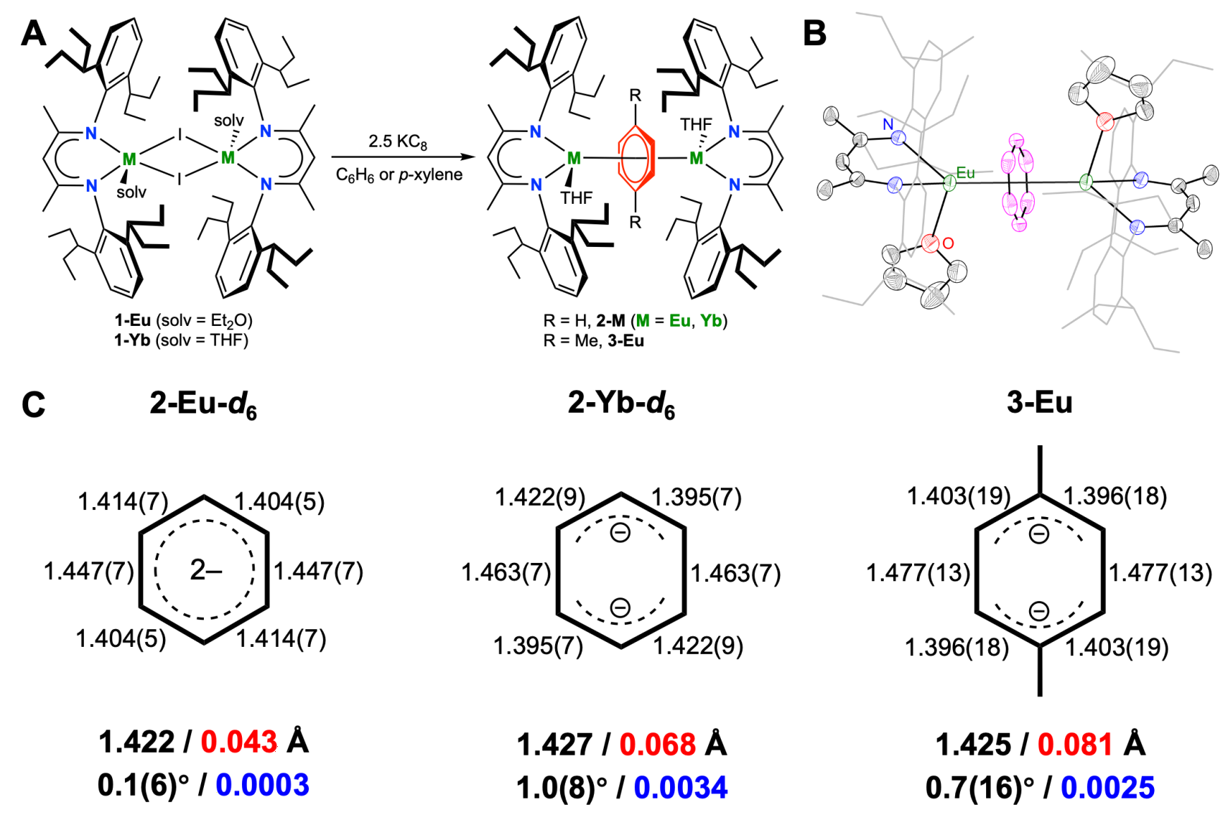 在黄闻亮团队前期合成中性的反三明治型稀土苯四负配合物的基础上(Chem. Sci. 2024, 15, 8740–8749),在该工作中,利用大位阻的β-二酮亚胺(BDI)合成了铕(II)和镱(II)的苯二负配合物[(BDI)M(THF)]2(μ-η6,η6-C6H6) (M=Eu: 2-Eu; M=Yb: 2-Yb)和[(BDI)M(THF)]2(μ-η6,η6-C6D6) (M=Eu:2-Eu-d6; M=Yb: 2-Yb-d6) (图2A)。核磁共振氢谱显示,2-Yb中苯二负离子的氢位于高场‒18 ppm处,而2-Yb-d6的氘谱也在‒16 ppm处观测到了相应的信号,表明2-Yb中苯二负离子可能存在反芳香性。此外,用对二甲苯替换苯,可以得到局域对称性降低的铕(II)的对二甲苯配合物[(BDI)Eu(THF)]2(μ-η6,η6-1,4-Me2C6H4) (3-Eu)。以上化合物均得到了单晶结构的表征,2-Eu-d6的结构如图2B所示。在这些配合物中,配位芳环的平均C‒C键长(1.42‒1.43Å)介于中性苯(1.391Å)与苯四负离子(1.44‒1.47Å)之间,与文献中苯二负离子的平均C‒C键长(1.42‒1.44Å)相近。此外,配位芳环保持高度的平面性(图2C),这与文献中大部分存在显著去平面化的苯二负离子不同。值得注意的是,在2-Yb-d6和3-Eu中,苯二负离子的C−C键长呈现出反醌式的“两长四短”模式,而在2-Eu-d6中,苯二负离子的C−C键长分布则较为均匀。以上结构特征表明,苯二负离子的电子结构可能同时受到稀土离子和局域对称性的影响。