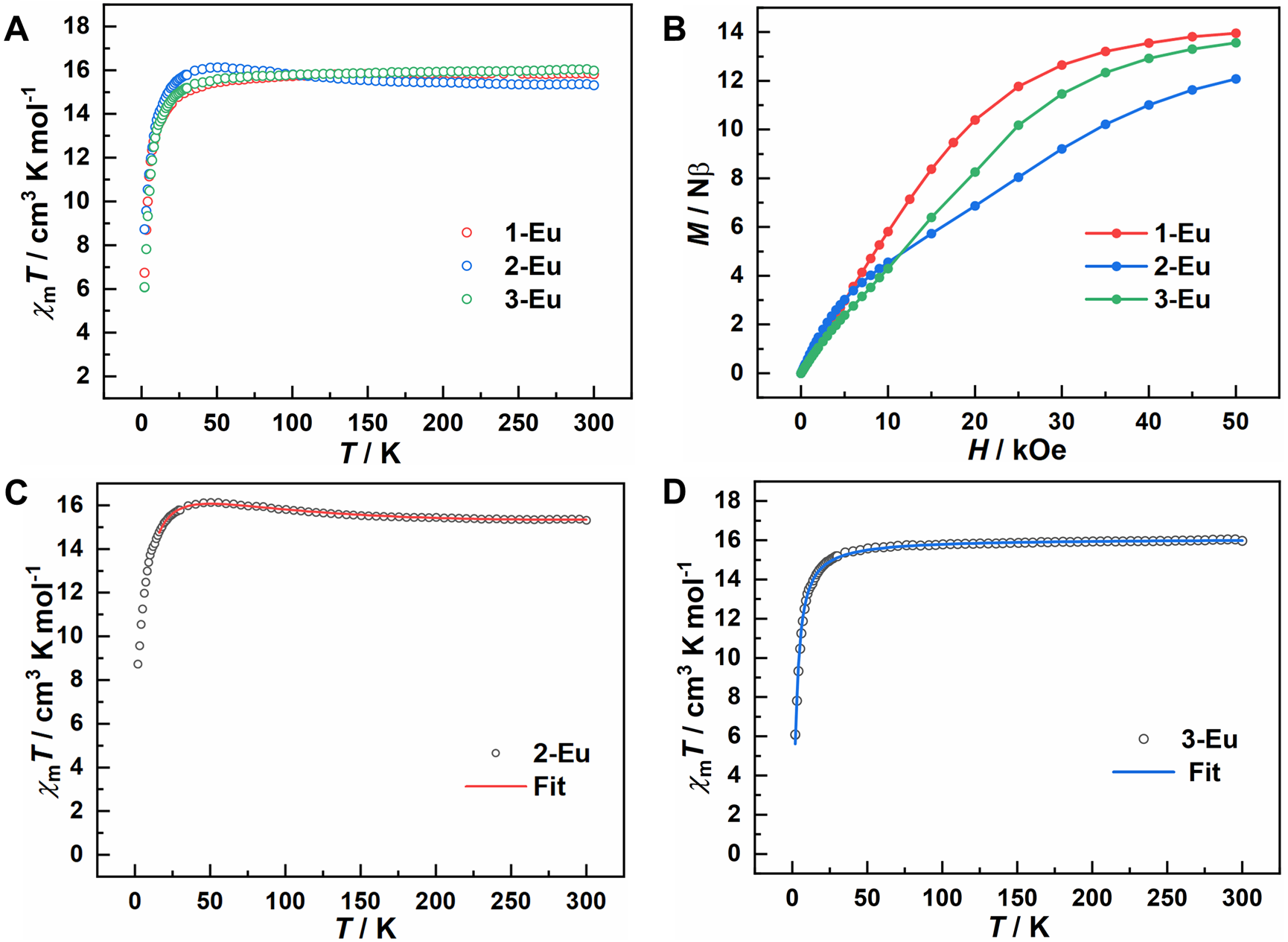 图3. 1-Eu、2-Eu和3-Eu的磁性数据(A)变温磁化率;(B)在2 K下的磁化强度;(C)2-Eu基于三中心自旋体系的拟合;(D)3-Eu基于两中心自旋体系的拟合