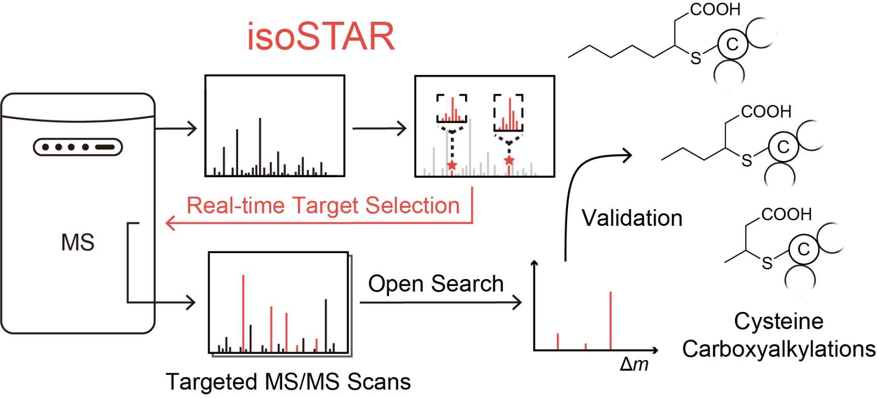 数据依赖性采集(Data-Dependent Acquisition,DDA)是基于质谱的蛋白质组学中最常用的检测方法之一,然而由于质谱扫描速度的限制,其仅会按强度由高到低顺序选择部分肽段离子进行碎裂及二级谱扫描,导致强度较低的肽段离子很难被检测到。王初课题组此前曾开发了基于硒同位素的靶向组学分析方法SESTAR(doi: 10.1021/acscentsci.8b00112)和SESTAR++(doi: 10.1016/bs.mie.2021.10.013),可以在质谱一级谱数据中选择性识别出可能含硒肽段的同位素信号,从而提升含硒肽段的鉴定效果。然而此方法需要两轮质谱检测才能完成,会造成检测时间及样品的浪费,并且因两次检测间的不平行造成通量减少甚至靶标丢失。在该工作中,作者利用仪器公司提供的质谱控制接口IAPI,在SESTAR基础上开发出了名为isoSTAR的质谱检测流程。isoSTAR利用快速同位素特征识别算法对靶标肽段特殊同位素信号进行实时识别,并立即向质谱发出靶向扫描请求,从而可以一步直接对低丰度靶标肽段进行深度的靶向检测。