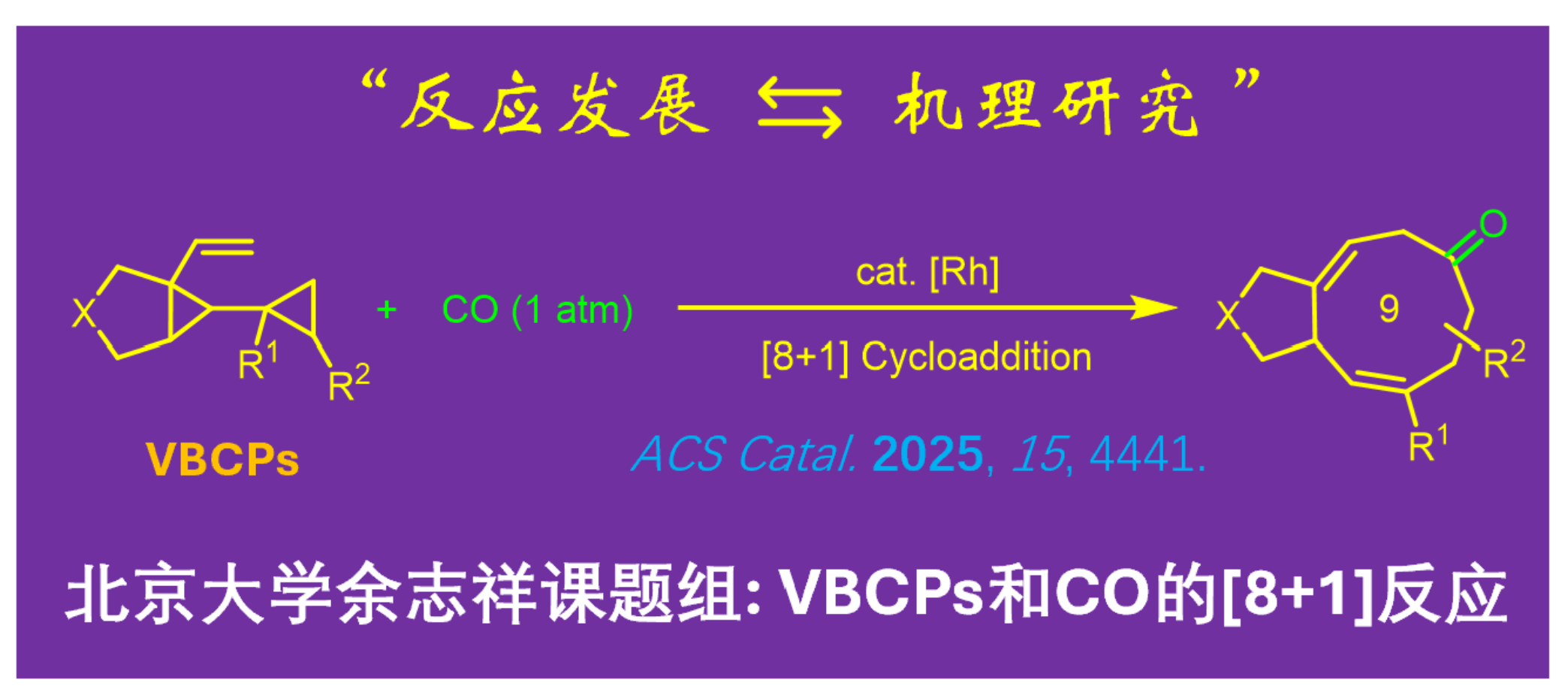 余志祥课题组长期致力于发展金属催化的成环反应、研究这些反应的机理并以这些成环反应为关键反应开展复杂天然产物的全合成研究。开发新的合成子(synthon)是发展成环反应的核心挑战和创新点。到目前为止,余志祥课题组开发了用乙烯基环丙烷作为三碳合成子的[3+2]、[3+2+1]、[4+3]和[4+3+1]环加成反应,用乙烯基环丁酮作为四碳合成子的[4+2]和[4+4]环加成反应,用丁二烯基环丙烷作为七碳合成子的[7+1]环加成反应。最近,余志祥课题组成功设计了一种新型八碳合成子——乙烯基双环丙烷(VBCPs),并发展了该合成子与CO(一碳合成子)在铑催化条件下构建九元碳环的[8+1]环加成反应。他们还对该反应进行了量子化学计算研究,阐明了反应机理和反应选择性的影响因素(ACS Catal. 2025, 15, 4441)。该工作是在余志祥教授指导下,由课题组的周艺博士、金奕、李鑫璇、刘喜佳博士、王熠博士完成。感谢国家自然科学基金委、北京分子科学国家研究中心及3003新葡官方网站高性能计算平台的支持。