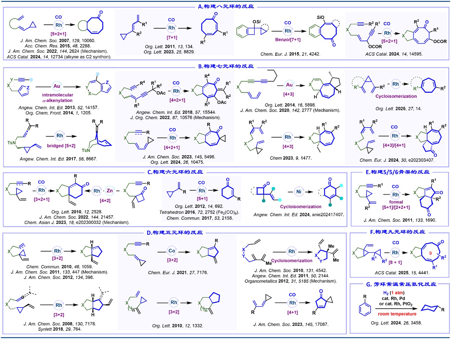 九元碳环存在于许多天然产物中,但其合成因不利的焓、熵效应以及高环张力(12.6 kcal/mol)而充满挑战。传统的环化反应如Aldol反应、Dieckmann缩合等容易生成热力学更稳定的小环副产物或分子间产物,扩环反应则需要通过多步反应预合成小环,而著名的烯烃关环复分解反应在九元环的合成中也鲜有报道。过渡金属催化环加成反应为碳环化合物的合成提供了独特且高效的工具。通过巧妙设计合成子并与各种过渡金属催化剂相结合,可构建不同大小的环状骨架。非常遗憾的是,合成九元碳环的环加成反应目前却仅有[4+4+1]、[4+3+2]、[7+2]三例。
