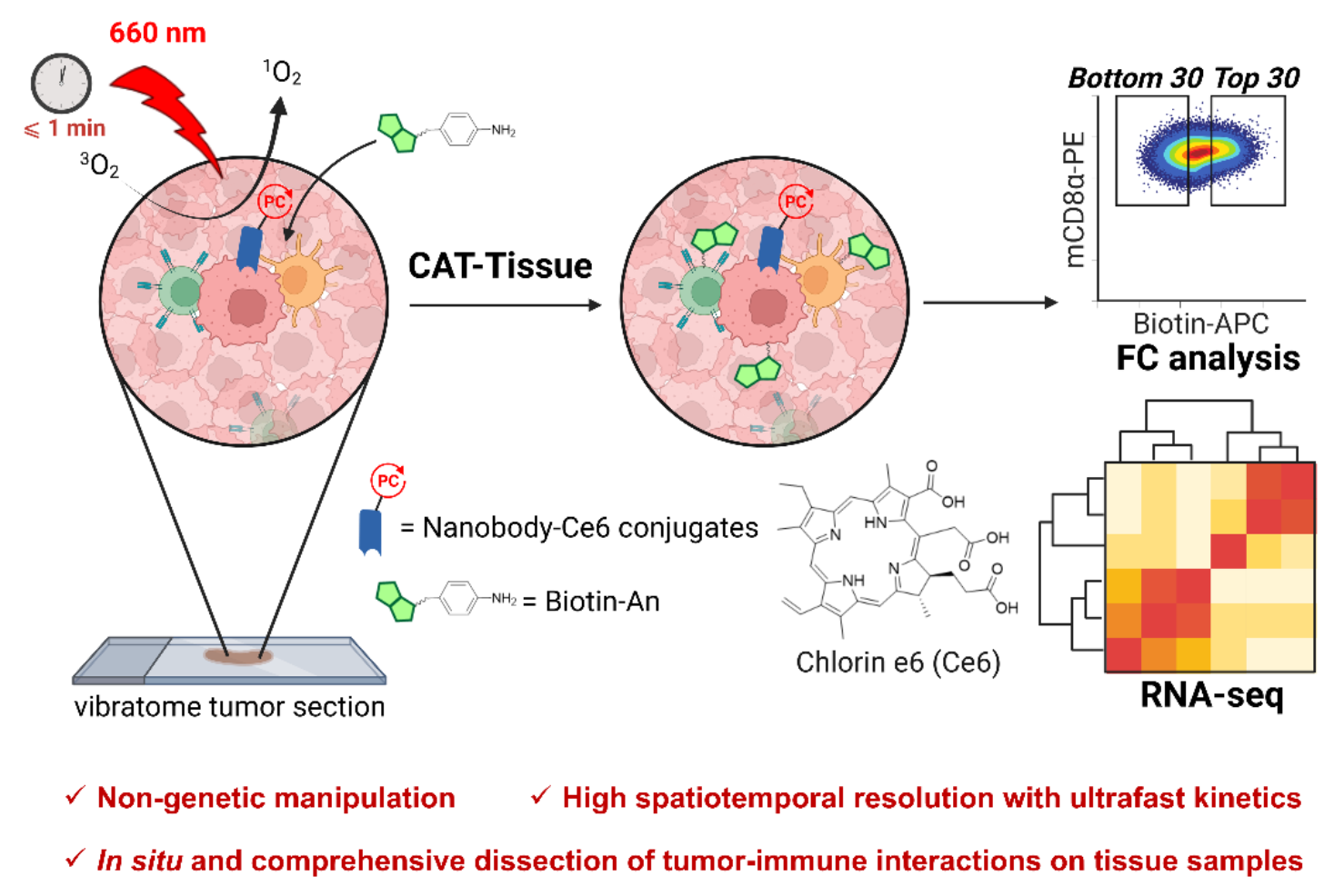 针对这一挑战,陈鹏、樊新元团队基于生物正交光催化概念,开发了一种深红光超快光催化邻近标记技术——CAT-Tissue,实现了组织原位上高分辨率的肿瘤-免疫细胞互作分析。该研究以“Deep-Red and Ultrafast Photocatalytic Proximity Labeling Empowered in situ Dissection of Tumor-Immune Interactions in Primary Tissues”为题,近日发表于《JACS》。CAT-Tissue利用二氢卟酚e6(Ce6)纳米抗体偶联物作为光催化剂,结合生物素-苯胺探针,在活肿瘤组织切片中快速、精准地标记并解析肿瘤-免疫相互作用。结合RNA测序,该技术揭示了肿瘤邻近与非邻近CD8+ T细胞之间的显著基因表达差异,尤其是肿瘤邻近CD8+ T细胞表现出激活、效应及耗竭表型。凭借深红光的优异组织穿透性及高生物相容性,CAT-Tissue无需基因改造即可高灵敏度地分析肿瘤-免疫相互作用,为深入理解肿瘤微环境提供了新的技术手段。