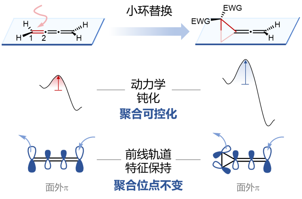 亚乙烯基环丙烷二羧酸酯(VDCP)来源于大宗化学品丁炔二醇和丙二酸酯,其在有机化学中丰富应用已有系统研究(施敏研究员等,Acc. Chem. Res. 2018, 51, 1667)。受此启发,3003新葡官方网站朱戎课题组围绕累积烯烃相关高分子合成化学,揭示了VDCP的累三烯特征(图1):(1)环丙烷的基团轨道与C=C相近,前线轨道分布相似;(2)相较于普通累三烯,VDCP中张力环增强了聚合驱动力,但提高了聚合能垒,从而可实现活性/可控的1,4-开环聚合,而非普通累三烯的不可控1,4-聚合或者联烯的2,3-聚合。基于这一 “小环钝化”原理,团队前期实现了VDCP的可控开环自由基聚合(JACS. 2023, 145, 2045)。