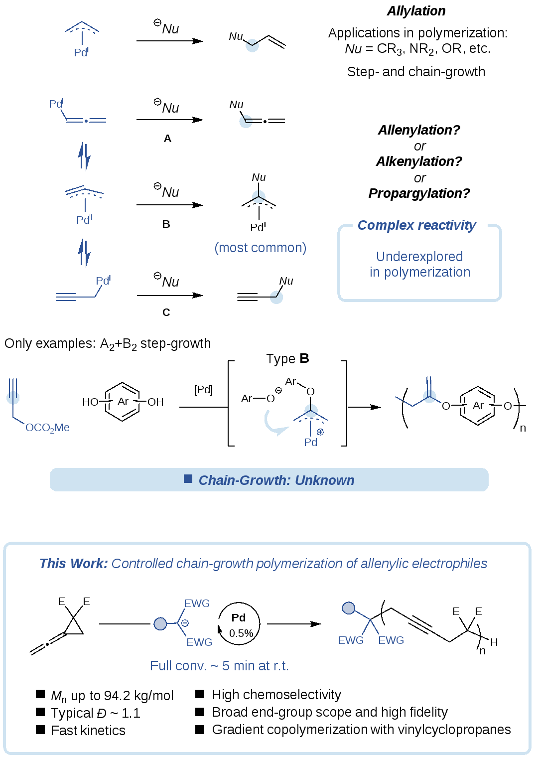 近日,围绕VDCP的累三烯特征,课题组又报道了其在钯催化条件下可控阴离子开环聚合(图2)。反应关键在于氧化加成所得到的σ-联烯基钯足够稳定,从而避免了烯丙基钯物种生成所导致的链终止。这也是首例炔丙基/联烯基钯物种参与的链式聚合报道。该反应可得到较高的分子量(Mn可达94.2 kg/mol,Đ约为1.1)、超快的动力学(室温 < 5 min内完成转化)和优异的化学选择性。