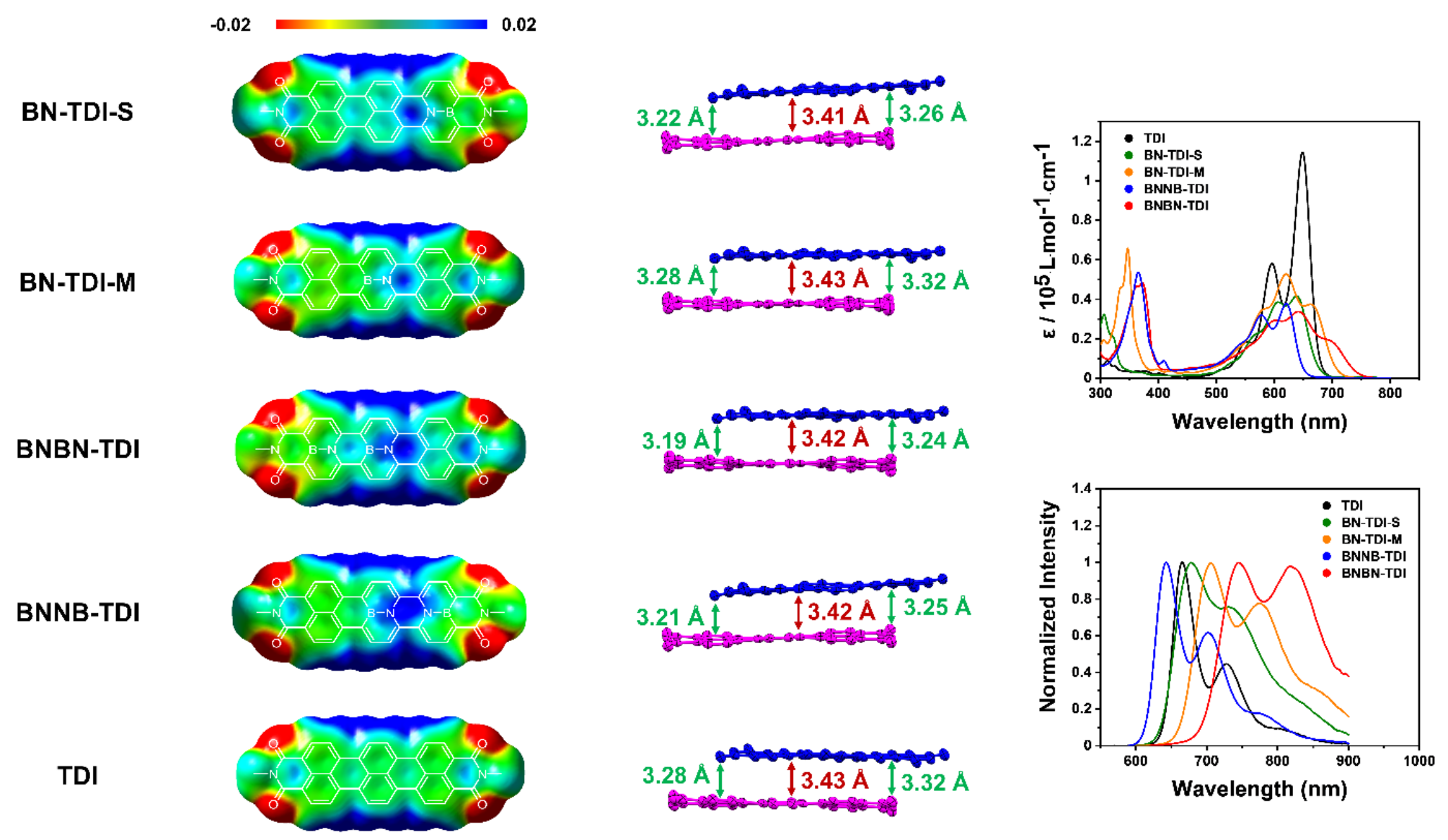 图2. BN-TDIs的静电势分布、单晶结构以及吸收和发射光谱。