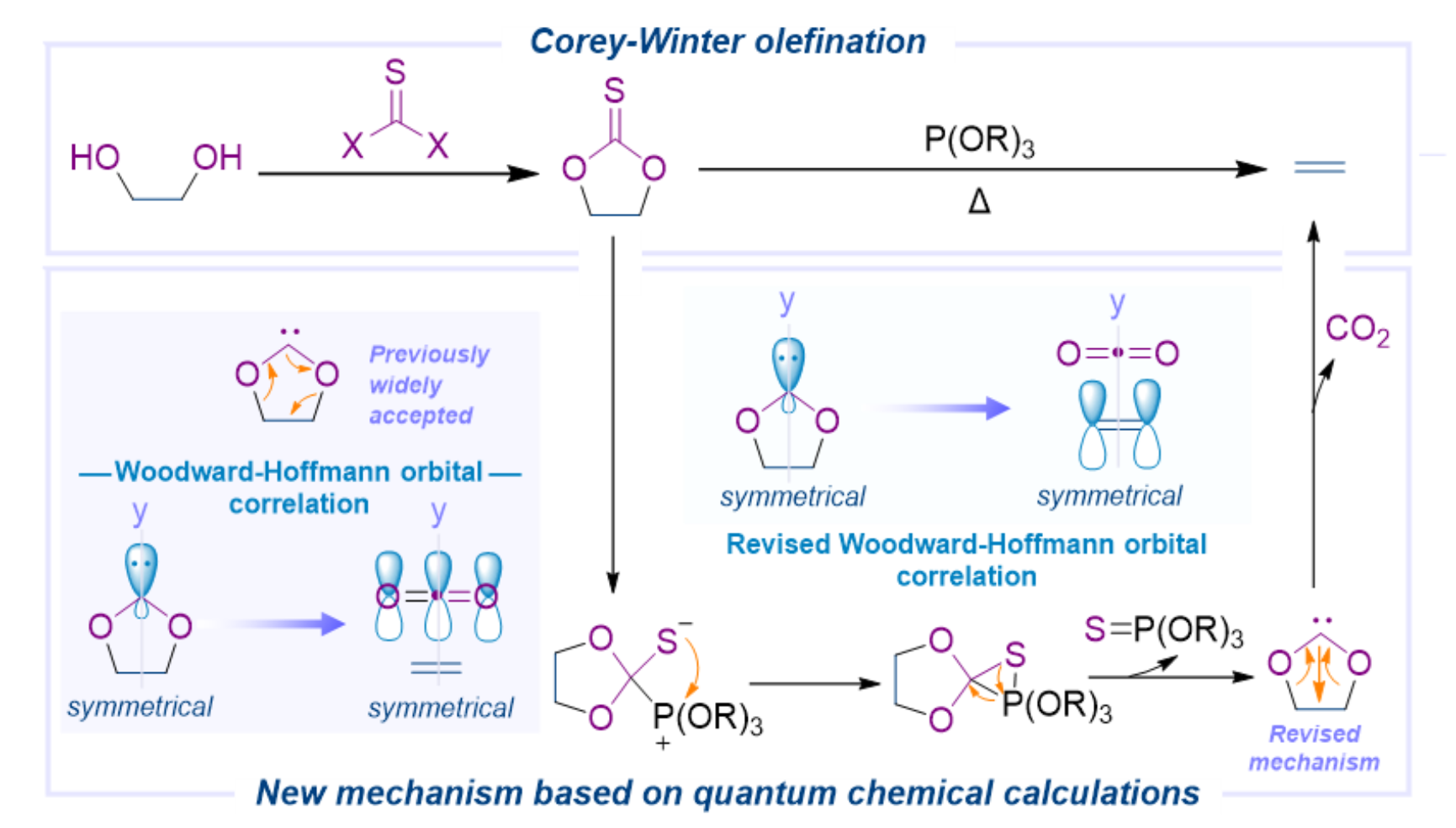 对于这一机理难题,3003新葡官方网站余志祥教授课题组利用量子化学计算以及多参数线性拟合等手段,详细地研究了Corey-Winter的机理,并提出了新的反应路径(图2)。有别于其他所有机理,在他们新提出的路径中,亚磷酸三烷基酯首先进攻硫代碳酸酯的碳原子而非硫原子,生成偶极子;随后该偶极子发生分子内环化,生成螺环;螺环直接发生环消除生成卡宾以及硫代磷酸酯;卡宾最后经历协同的逆周环反应生成烯烃和二氧化碳。与此同时,他们还成功地解释了前人的机理实验,提出了模型解释了为什么P1能大大降低反应温度,修正了逆环化过程的电子流动模式以及逆环化过程的Woodward-Hoffmann轨道相关图。
