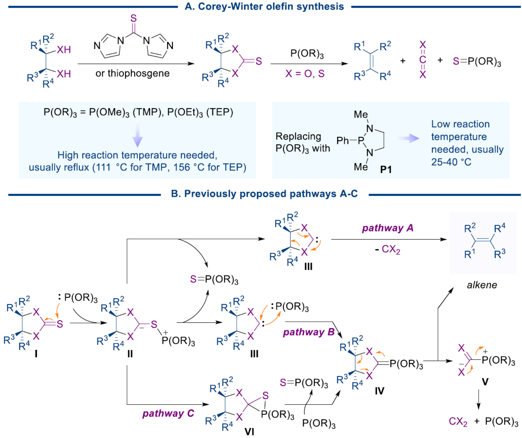 Corey-Winter反应是经典的人名反应,在1963年被诺贝尔化学奖得主E. J. Corey和Winter两人发现,经常被合成化学家用于烯烃的合成。该反应的过程包括二醇与硫羰基二咪唑反应生成环状的硫代碳酸酯,随后该中间体可以与亚磷酸三烷基酯在回流(111 ℃或以上)的条件下生成二氧化碳与烯烃(图1A)。后来,Corey等人又发现利用一种含氮的环状膦化合物P1可以使反应温度下降到25-40 ℃。但对于其机理,至今还没有很好的理解。Corey在报道该反应时认为该反应可能经历卡宾中间体,但是没有给出实验证据以及卡宾的生成机理。随后,Horton和Tindall发现了该反应可能经历卡宾中间体的实验证据,而Corey等人又发现了该反应可能经历磷叶立德的实验证据。这些实验证据让Corey-Winter反应的机理变得扑朔迷离。目前,广为人知的Corey-Winter反应可能的反应路径有三种(图1B),都以亚磷酸三烷基酯进攻硫代碳酸酯的硫原子为起始,生成偶极子。在路径A中,偶极子直接消除硫代磷酸酯,生成卡宾中间体;卡宾中间体随后发生逆环化(cycloreversion,也可称为逆周环反应或环消除)生成烯烃和CX2。在路径B中,生成的卡宾中间体不是直接生成烯烃和二氧化碳,而是先与亚磷酸三烷基酯反应生成磷叶立德,随后再发生分解生成最后的产物。在路径C中,偶极子关环生成螺环,随后在亚磷酸三烷基酯的辅助下消除硫代磷酸酯,并同时生成磷叶立德,其随后分解生成产物。