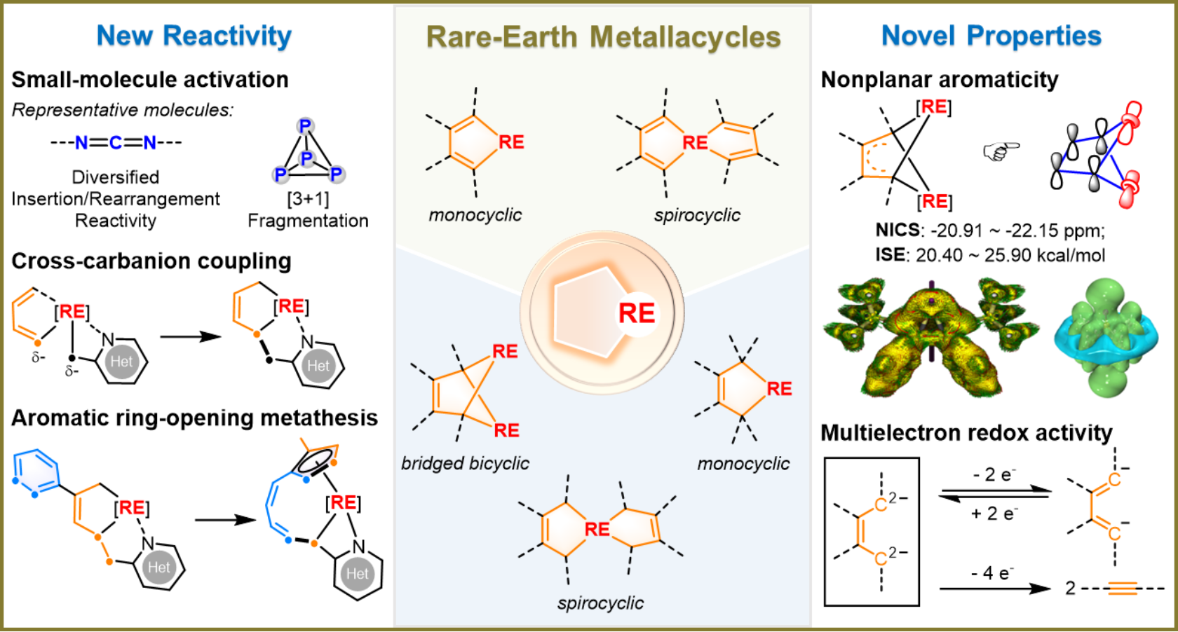 稀土是我国重要的战略资源,也是不可再生资源。由于其独特的4f电子结构以及特殊的物理和化学性质,稀土元素在基础研究和应用研究中均具有重要意义。稀土金属有机配合物在小分子和惰性化学键活化、烯烃聚合、有机合成催化等领域发挥着重要作用,其反应类型、选择性及适用底物范围常与过渡金属体系形成互补。因此,稀土金属有机配合物在新物质创造中展现出不可替代的作用!金属有机杂环作为金属有机化学中的核心结构单元,经过数十年的发展,已在现代有机合成、配位化学及相关反应机制研究中发挥了关键作用,推动了包括诺贝尔奖成果在内的诸多重大进展。目前,主族与过渡等金属有机杂环体系已得到广泛探索,而稀土金属有机杂环的研究仍明显滞后。这主要因为:稀土-碳键高度极化,导致体系反应性过高,难以分离和表征;稀土金属氧化态单一,传统氧化环金属化方法不适用于稀土金属有机杂环的构建。