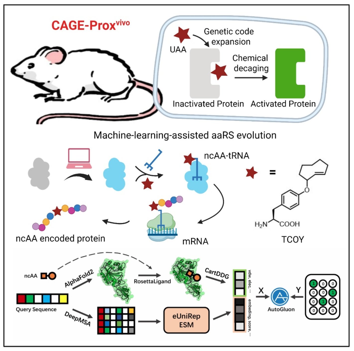 机器学习模型成功进化出可识别反式环辛烯-半胱氨酸(TCOC)的PylRS变体,并通过CAGE-Proxvivo策略实现了半胱氨酸的可控化学遮蔽以及活体内蛋白功能的精准调控