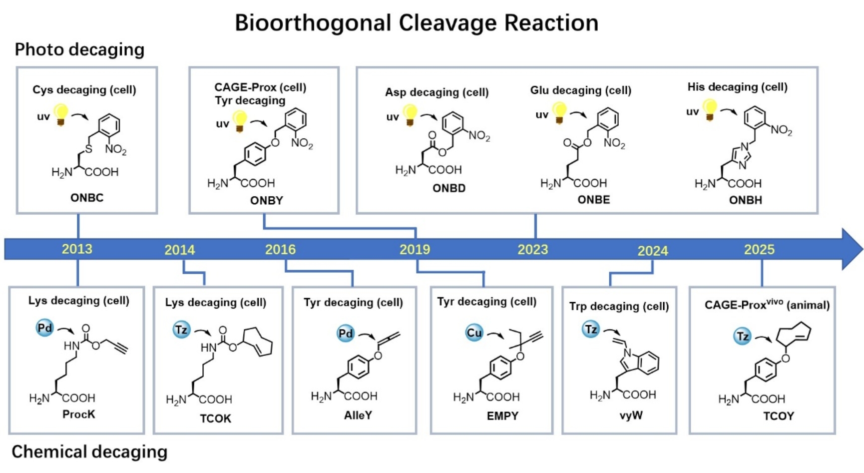 陈鹏课题组长期致力于“活细胞化学反应”的开发与应用,在国际上率先提出并发展了基于“断键”化学的生物正交反应——生物正交剪切反应(Bioorthogonal Cleavage Reaction,Nat. Chem. 2014, 6, 352.)。与传统的“连接”反应不同,这种剪切反应通过化学键的断裂,实现对靶标分子中掩蔽基团的时空可控释放。该策略突破了利用化学反应调控生物大分子功能的技术瓶颈,实现了蛋白质在活细胞等环境中的精准“脱笼”和激活,使得生命过程和分子互作在特定的时间和空间内被精确开启,为活细胞的功能研究开辟了新的途径。