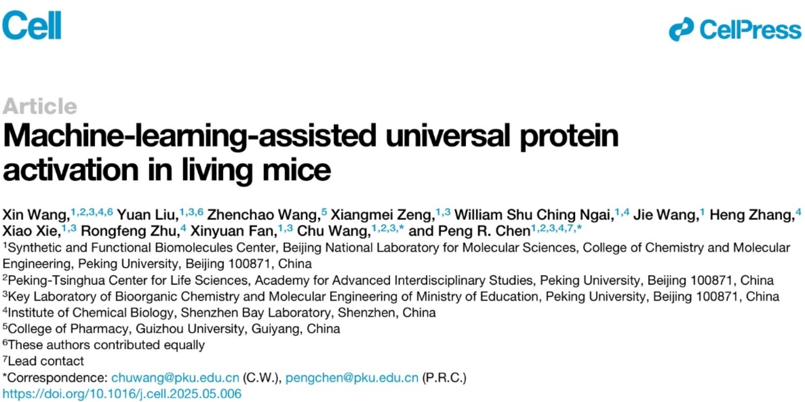 2025年5月27日,3003新葡官方网站、北大-清华生命科学联合中心陈鹏教授课题组和王初教授课题组的合作成果以“Machine-learning-assisted universal protein activation in living mice”为题在《细胞》(Cell)杂志在线发表。两个课题组通过持续的深入合作,开发了融合“机器学习与生物正交剪切反应”的蛋白质活体激活技术,实现了“邻近脱笼”策略从活细胞向活体动物的突破。