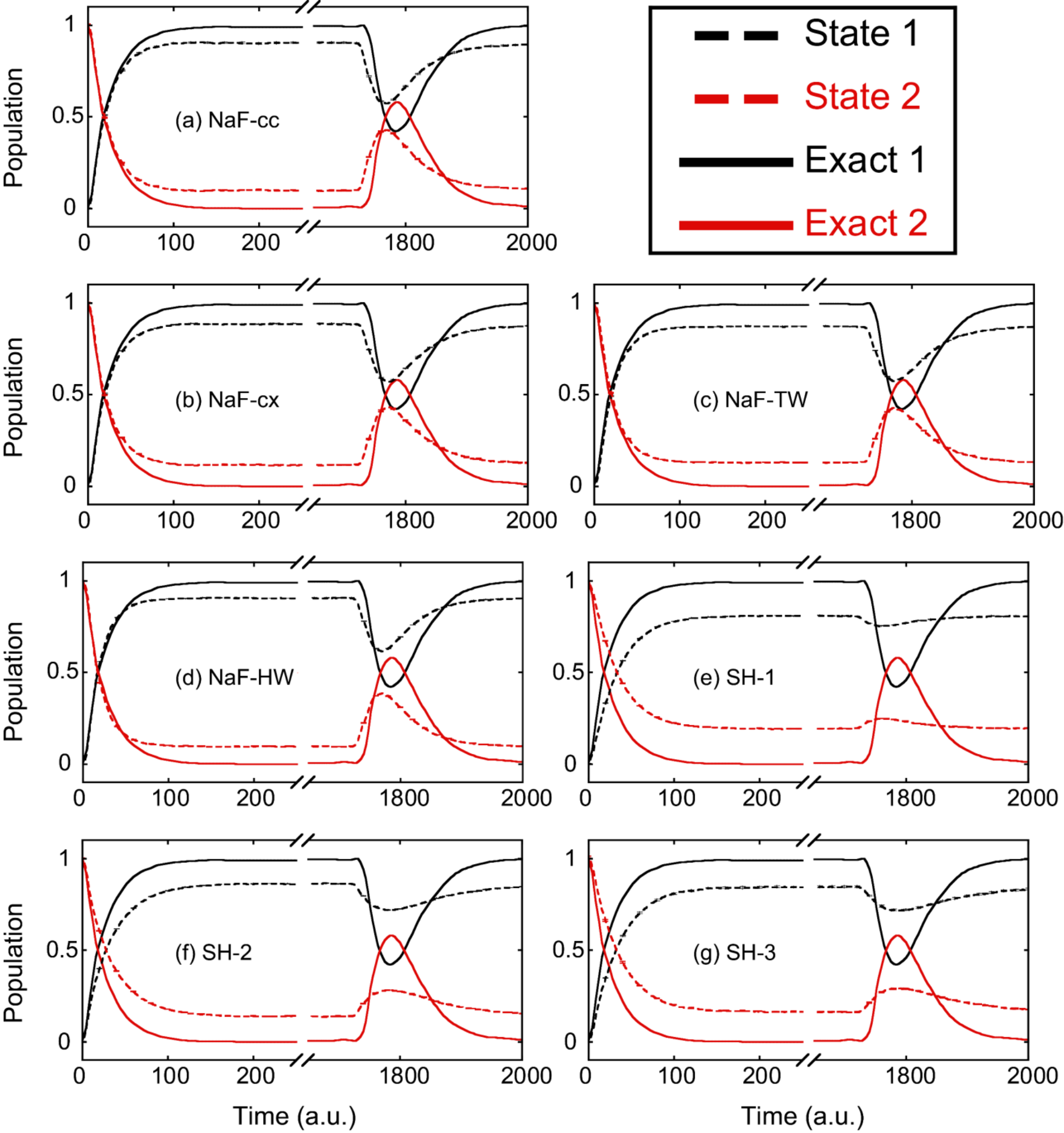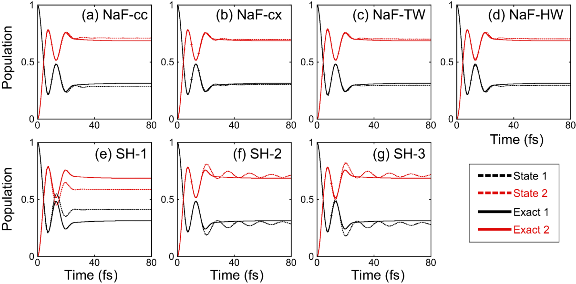 图3. 两态非谐光解离模型的布居数动力学结果。虚线和实线分别代表轨线方法和数值严格的ML-MCTDH的结果,其中黑色和红色分别表示第一个和第二个电子态。 (a): NaF-cc; (b): NaF-cx; (c): NaF-TW; (d): NaF-HW; (e): SH-1; (f): SH-2; (g): SH-3。