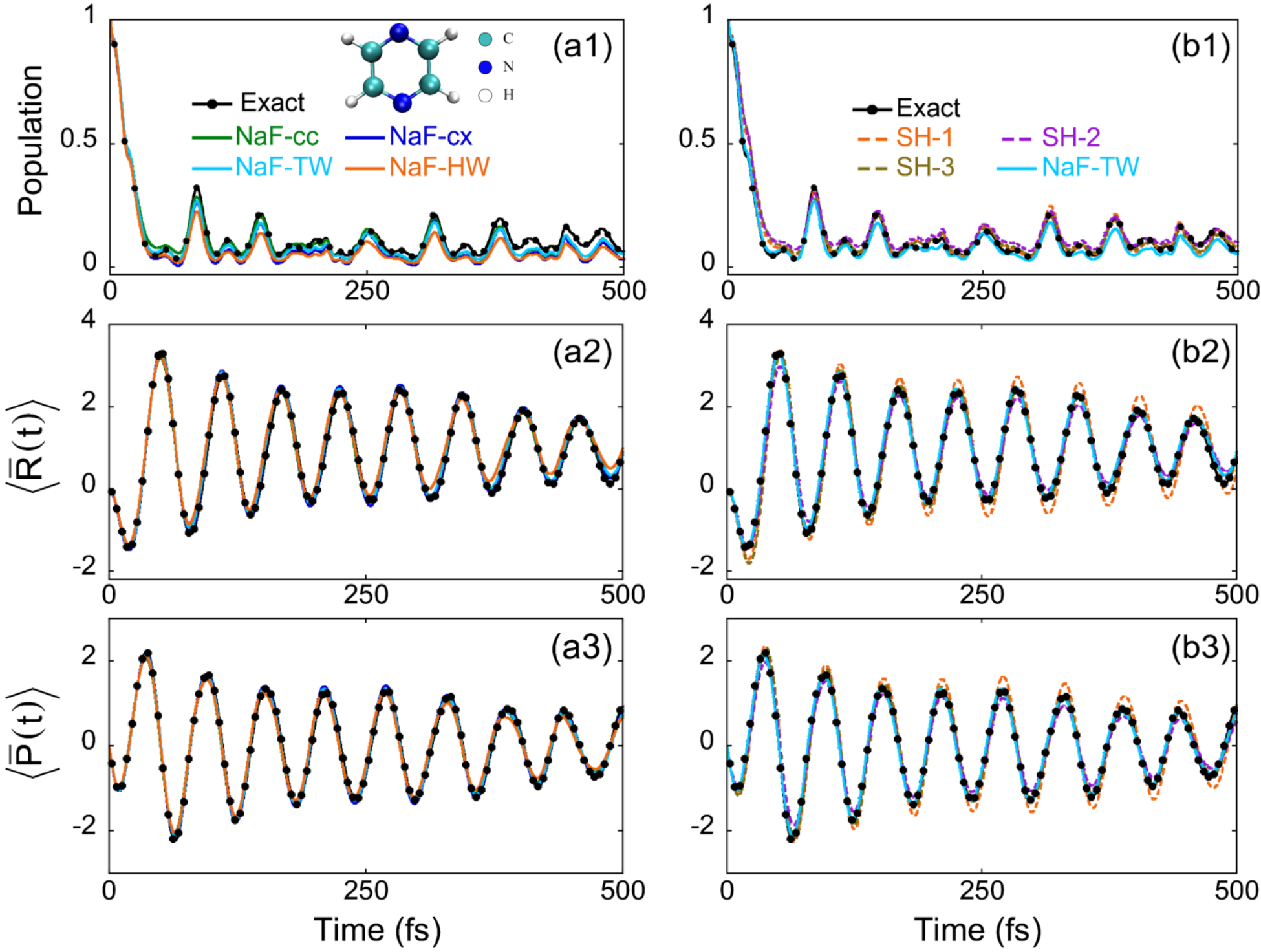 图1. 吡嗪的两态24模式线性振动耦合模型的动力学结果。从上至下三行分别是第二个电子态的布居数、原子核的位置平均值和动量平均值随时间变化的结果。图(a1)-(a3)中,绿色、蓝色、青色和橙色实线分别代表NaF-cc, NaF-cx, NaF-TW和NaF-HW的结果。图(b1)-(b3)中,橙色虚线、紫色虚线、棕色虚线和青色实线分别代表SH-1,SH-2,SH-3和NaF-TW的结果。各自图中的黑色圆点+实线代表数值严格的MCTDH的结果。