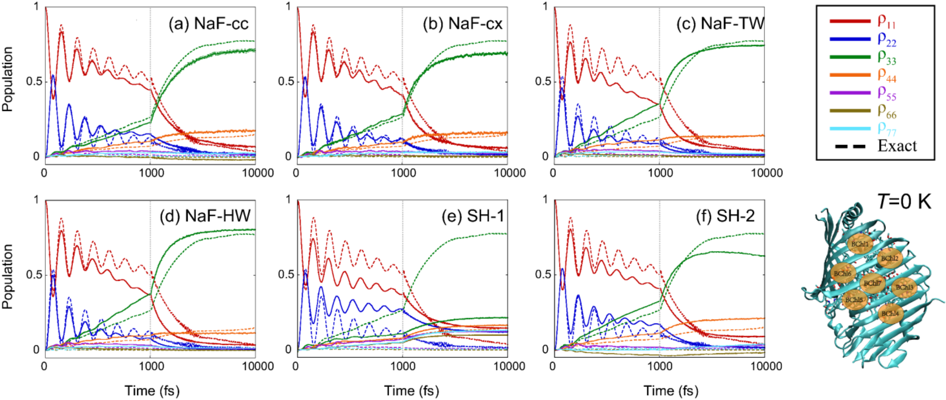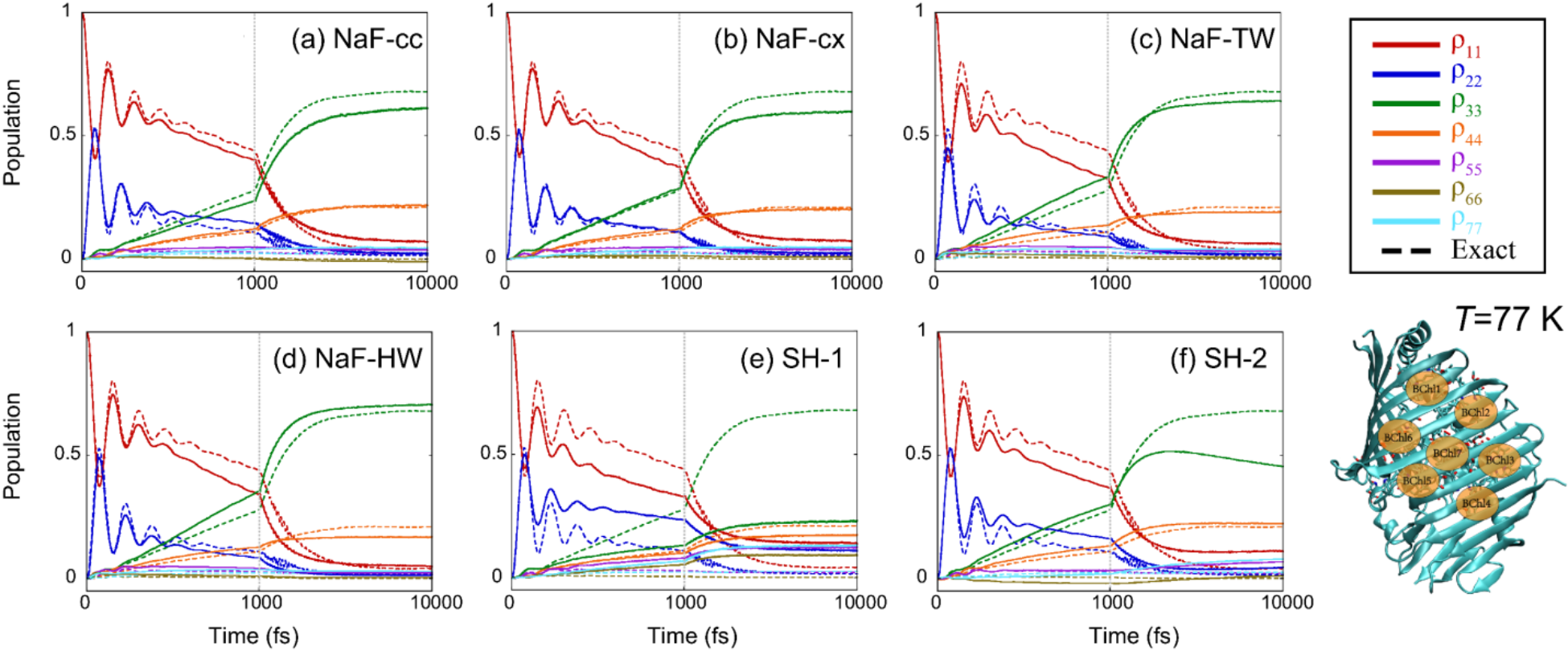 图4. FMO模型在77 K下的布居数动力学结果。红色、蓝色、绿色、橙色、紫色、棕色和青色实线分别表示轨线给出的七个电子态的布居数结果。 (a): NaF-cc; (b): NaF-cx; (c): NaF-TW; (d): NaF-HW; (e): SH-1; (f): SH-2。由于SH-3只能用于两态体系,因此无法给出此七态体系的模拟结果。数值严格结果由TD-DMRG模拟得到,以相应颜色的虚线绘制在各子图中。
