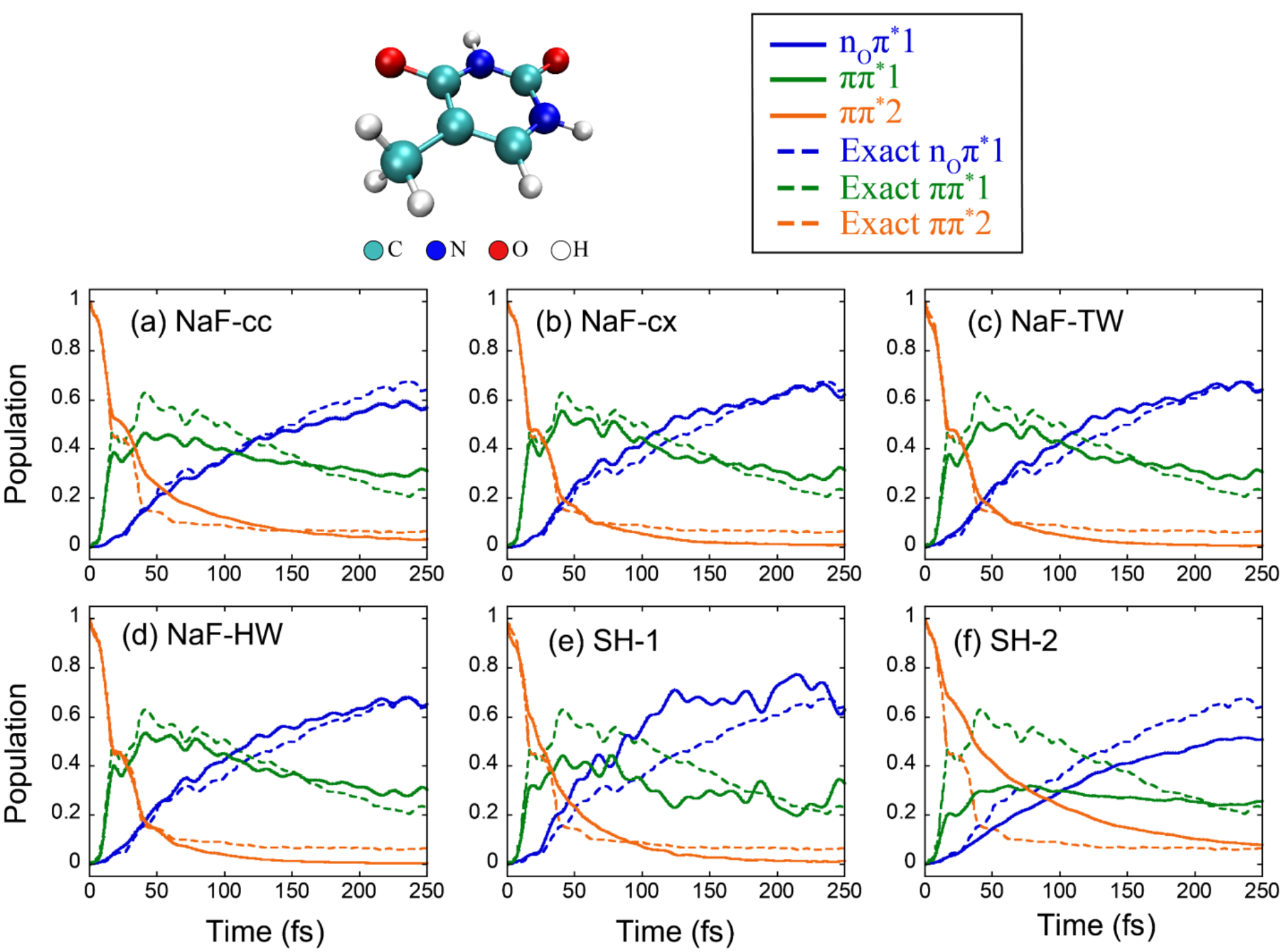 图2. 胸腺嘧啶的线性振动耦合模型的布居数动力学结果。实线和虚线分别代表轨线方法和数值严格的ML-MCTDH的结果,其中蓝色、绿色和橙色分别表示三个不同的电子态。 (a): NaF-cc; (b): NaF-cx; (c): NaF-TW; (d): NaF-HW; (e): SH-1; (f): SH-2。由于SH-3只能用于两态体系,因此无法给出此七态体系的模拟结果。