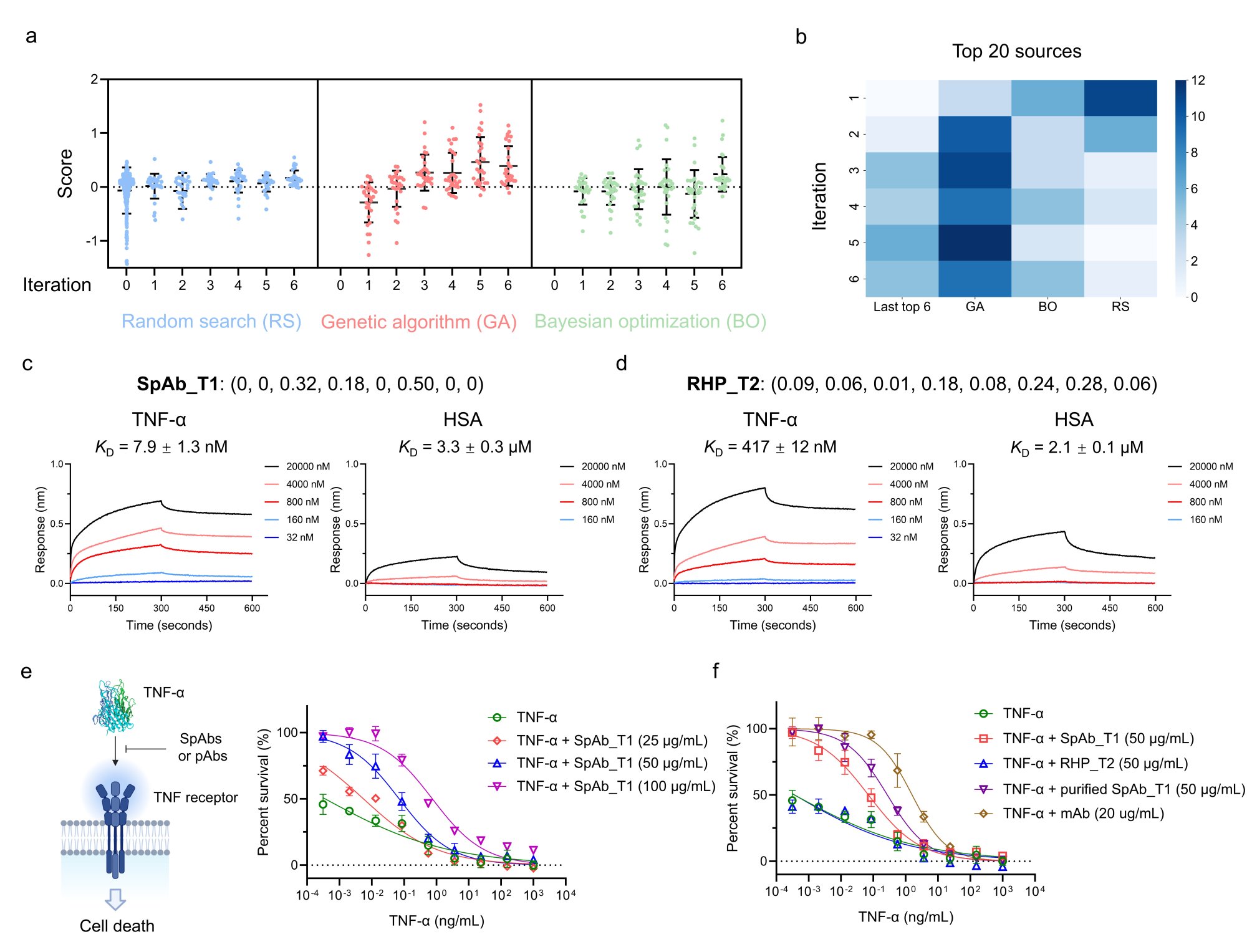 图2. (a) 数据驱动筛选靶向TNF-α的人造多克隆抗体,RS:随机搜索,GA:遗传算法,BO:贝叶斯优化,图中每个点代表了一个RHP的评分;(b) 每轮Top 20 RHP的来源;(c) BLI测试评分最高的SpAb_T1对TNF-α和HSA的结合力;(d) 随机点RHP_T2对TNF-α和HSA的结合力;(e)不同浓度SpAb_T1对TNF-α诱导细胞毒性的中和作用;(f) 不同亲和力RHP对TNF-α的中和作用