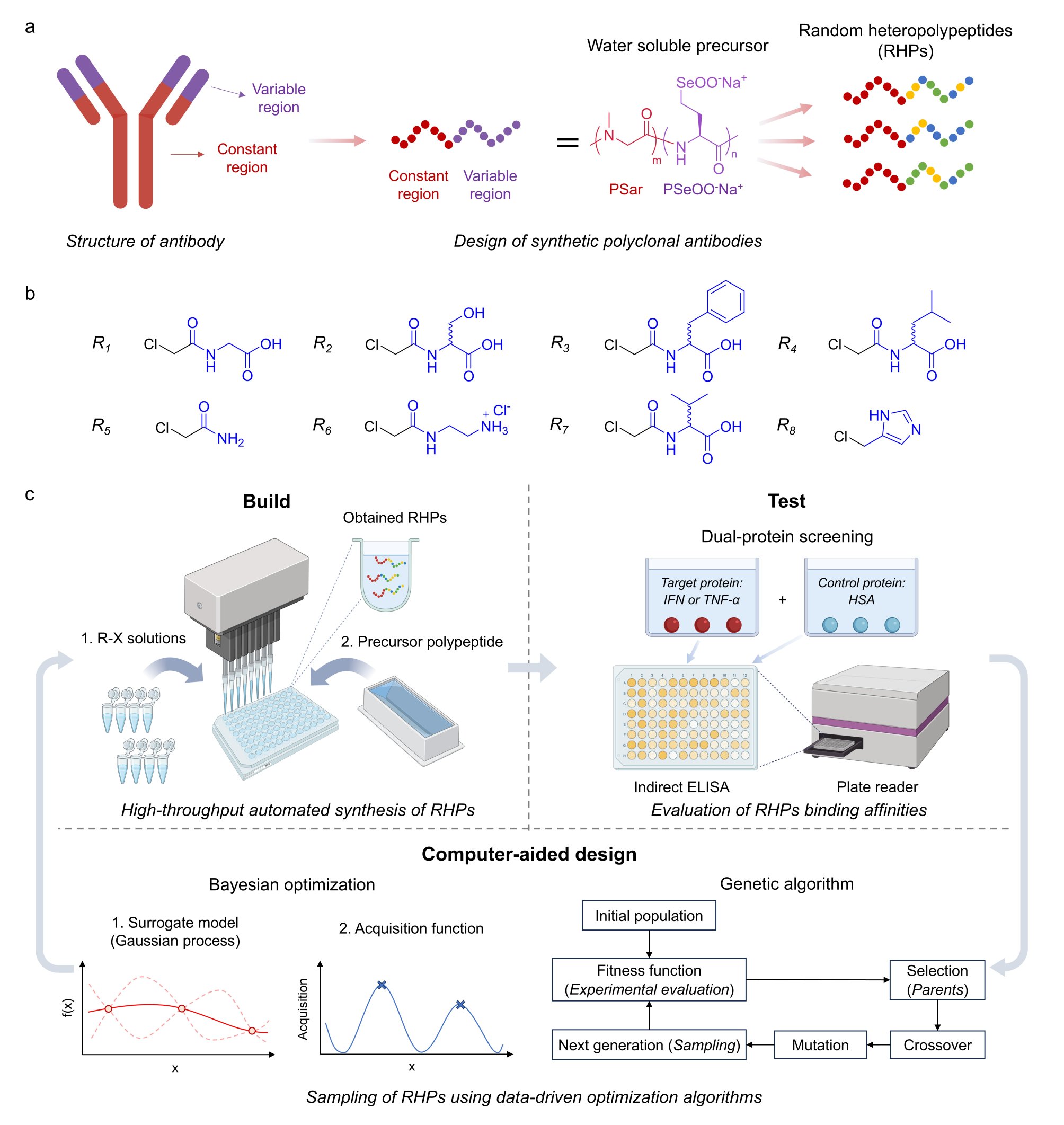 为了从成千上万种可能的组合中快速筛选出能够像抗体一样高效识别目标蛋白RHP,作者设计了一个“自动化高通量实验+数据驱动”的闭环工作流程,可分为以下几个步骤(图1c):