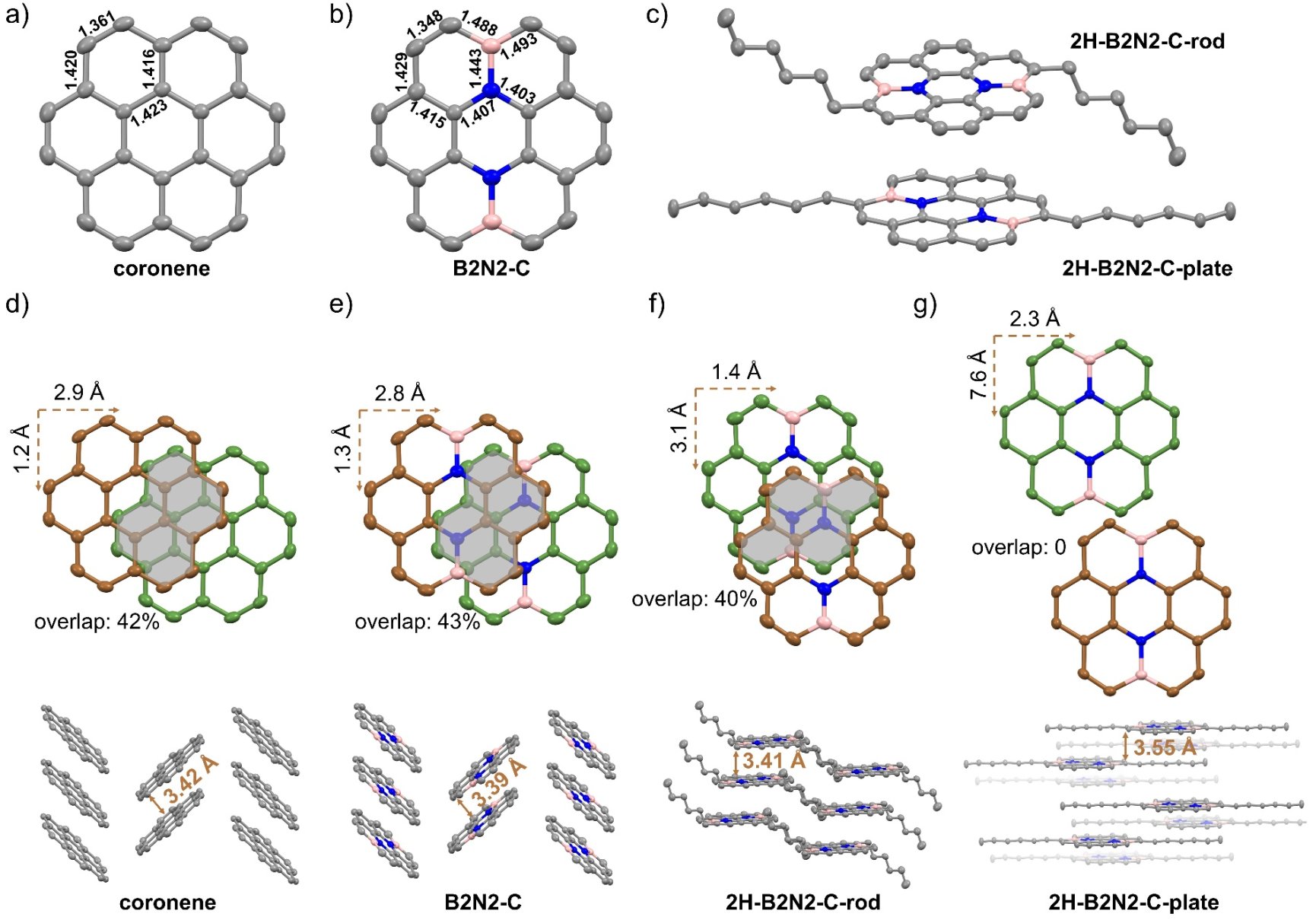 由于等电子特性,B2N2-C具有与蔻相似的平面几何构型和鱼骨状排列(图2),π-π堆积距离从3.42 Å缩短至3.39 Å,表明B-N偶极-偶极相互作用增强了π堆积效应。而烷基链取代的2H-B2N2-C产生了两种稳定的结晶相,分别是以π-π堆积为主导的棒状相和以C-H···π堆积为主导的片状相。三种硼氮杂蔻分子的晶体结构均表现出平行的B-N偶极排列,表明B-N诱导分子有序组装的特性。计算表明,B2N2-C相比蔻的π-π相互作用能提升了1.27 kcal/mol,体现了B-N偶极所提供的额外相互作用。溶液光谱测试表明,随浓度升高,硼氮杂蔻系列分子均会表现出蔻所没有的激基缔合物发射,进一步证明了B-N偶极诱导分子形成了有序的组装体,表明B-N偶极可为调控分子的聚集态发射提供新途径。粉末紫外-可见-近红外漫反射光谱表明,B-N偶极使带隙显著变窄了0.41 eV,而随着烷基链增加,带隙逐步增大。并结合理论计算结果表明,B2N2-C具有收窄的固态带隙和增强的电子耦合,在未来有机电子材料方面具有广泛的应用前景。基于H-B2N2-C旋涂制备的薄膜,表现出了2.8×10−4 cm2 V‒1 s‒1的空穴迁移率。