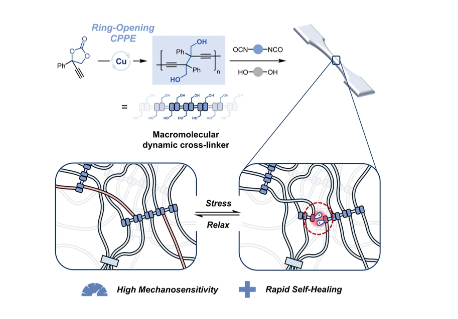 力化学敏感基元的引入为功能高分子材料的开发带来了新思路,而在体相材料中实现高效可逆的力化学响应仍然较为挑战。朱戎课题组近年发展了一系列基于累积烯烃的聚合方法(JACS, 2022, 144, 8807;JACS, 2022, 144, 4315;JACS, 2023, 145, 23755;JACS, 2023, 145, 2045;JACS, 2024, 146, 19377;Nat. Commun., 2025, 16, 2506;Nat. Synth., 2025, 4, 702等),在此基础上,课题组近期开发了一种铜催化环碳酸酯开环聚合反应(RO-CPPE),经由累积五烯中间体,构建了新型动态力敏高分子骨架。该骨架中弱碳碳键在外力作用下能够可逆断裂生成自由基;其侧链羟基可参与聚氨酯交联(1.8wt%添加比例),得到具有室温快速自修复功能及力学性能提升的弹性体。通过力敏碳碳键在主链中的串联,弹性体可将应力高效集中于交联点处,从而大幅提升体相力化学响应。