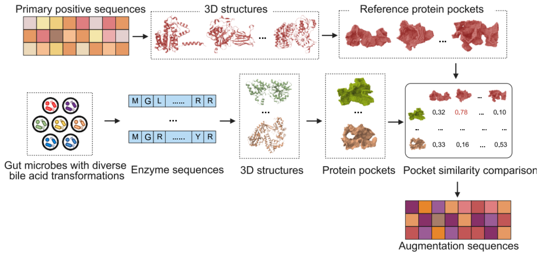 考虑到胆汁酸分子具有相似的甾体环结构,与酶活性口袋的相互作用存在相似之处,团队收集了蛋白质结构数据库中已知的酶-胆酸复合物结构,利用来鲁华教授团队开发的Cavity口袋分析工具4提取酶的活性口袋,利用PocketMatch工具5比较口袋相似性,发现尽管不同的胆汁酸代谢酶序列和结构差异较大,但结合胆汁酸底物的活性口袋具有相似性。团队使用Cavity工具分析得到了已知胆汁酸代谢酶中的85个活性口袋,然后以文献报道的具备高胆汁酸代谢多样性的7种微生物蛋白组为起点,使用ESMFold3进行蛋白质结构预测、Cavity口袋提取与过滤口袋并用PocketMatch进行口袋相似性计算,找到2330个可能的胆汁酸代谢酶用做AI模型训练的正样本增强序列(图1)。