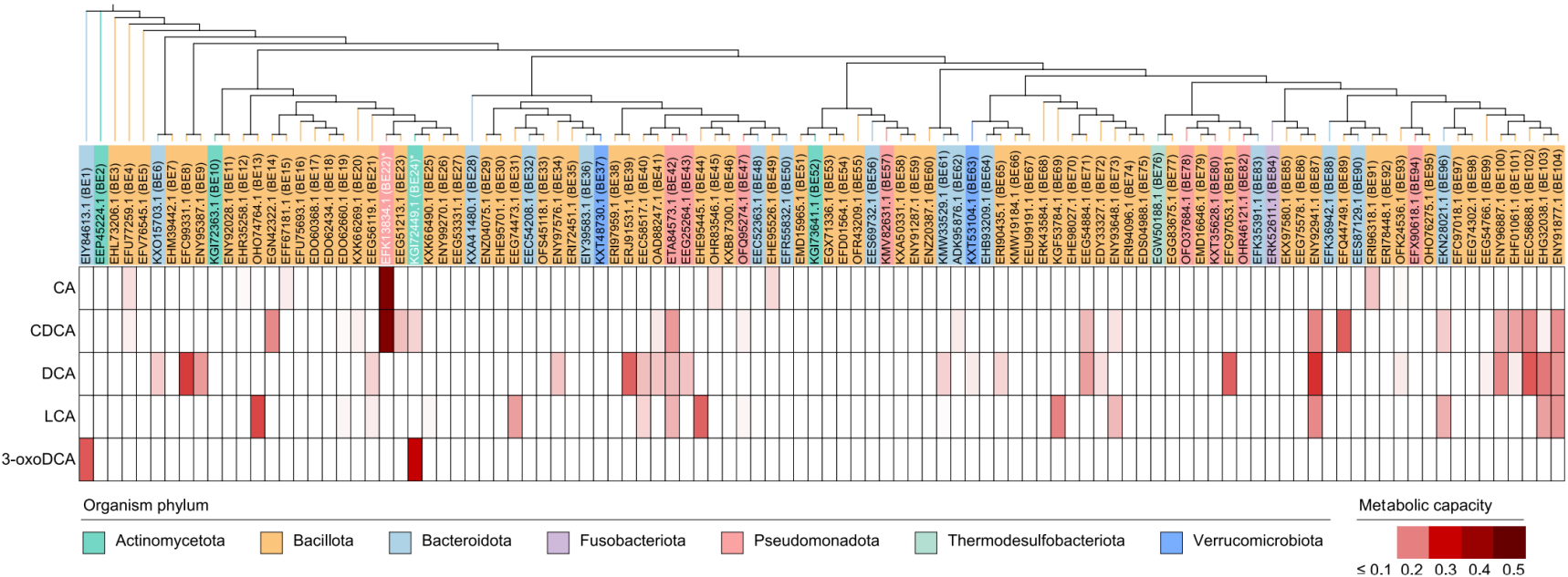 研究团队使用BEAUT对约234万条人体微生物参考基因组包含的蛋白质进行了筛选,发现了约60万条潜在的菌源胆汁酸代谢酶,并构建了人体微生物胆汁酸代谢酶(HGBME)数据库(https://beaut.bjmu.edu.cn/database)。进一步评估了108株肠道菌对于5种胆汁酸(CA/CDCA/DCA/LCA/3-oxoDCA)的代谢能力,发现代谢能力与BEAUT预测的潜在代谢酶数量正相关。合作团队在预测结果中选择了102种酶进行实验验证,评估对于5种胆汁酸的代谢能力,发现其中有47种酶能够代谢至少一种胆汁酸(图3)。这表明BEAUT可以用于预测完全未知的胆汁酸代谢酶,可以大大提高对实验发现胆汁酸代谢酶的效率。