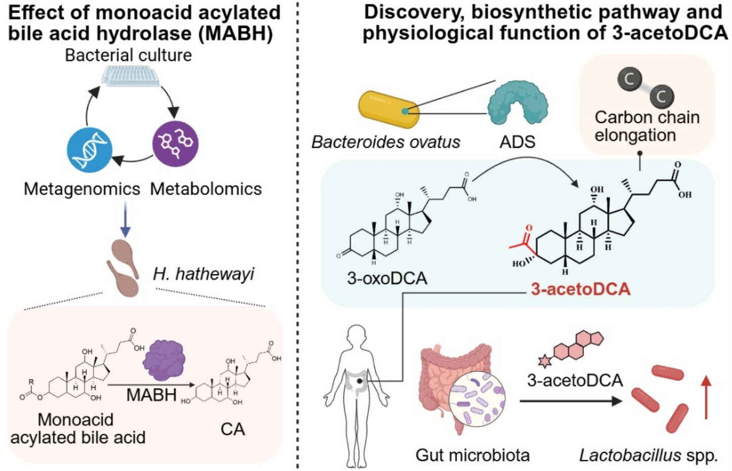 基于BEAUT对菌株蛋白组的预测筛选,合作研究团队首次发现了肠道细菌Hungatella hathewayi中代谢3-酰基胆酸的酰化胆酸水解酶MABH(图4左)。由于3-酰基胆酸是一种肠道FXR强抑制剂,能有效改善宿主代谢紊乱,所以MABH可能是潜在的代谢疾病靶标。该酶的序列在UniProt中被自动标注为Sialate O-acetylesterase家族成员,无法据此推断出该酶代谢胆汁酸的功能。此外,研究团队还通过BEAUT首次发现了独特的“双尾素”类胆汁酸3-乙酮脱氧胆酸(3-acetoDCA)及其合成酶ADS(图4右)。3-乙酮脱氧胆酸是首次发现的全新碳骨架类型胆汁酸,与经典的胆汁酸受体均无相互作用,但能调控肠道共生菌Lactobacillus gasseri等乳杆菌的生长,并促进小鼠体内吲哚-3-乳酸的产生,介导了一类肠道菌群互作的新模式。