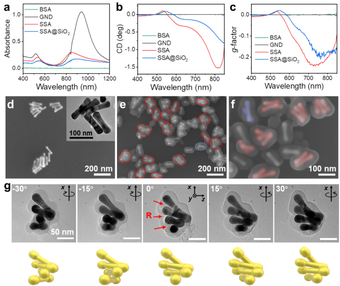 图2 所示的GND手性组装体的光学与形貌表征结果表明,在优化条件下获得的组装体表现出强烈的圆二色性信号,其光学不对称因子(g因子)高达0.23,显著高于迄今报道的由非手性纳米粒子构筑的组装体的g因子。利用二氧化硅包覆技术,并结合冷冻透射电镜和液相原位透射电镜等多种表征手段,明确观察到金纳米哑铃呈现肩并肩螺旋排列(SSAs),证实了偏好右旋型的手性纳米组装结构的形成。进一步通过实验研究结合理论模拟,揭示了纳米组装基元凹形形貌对手性组装体稳定性和光学活性的促进作用。