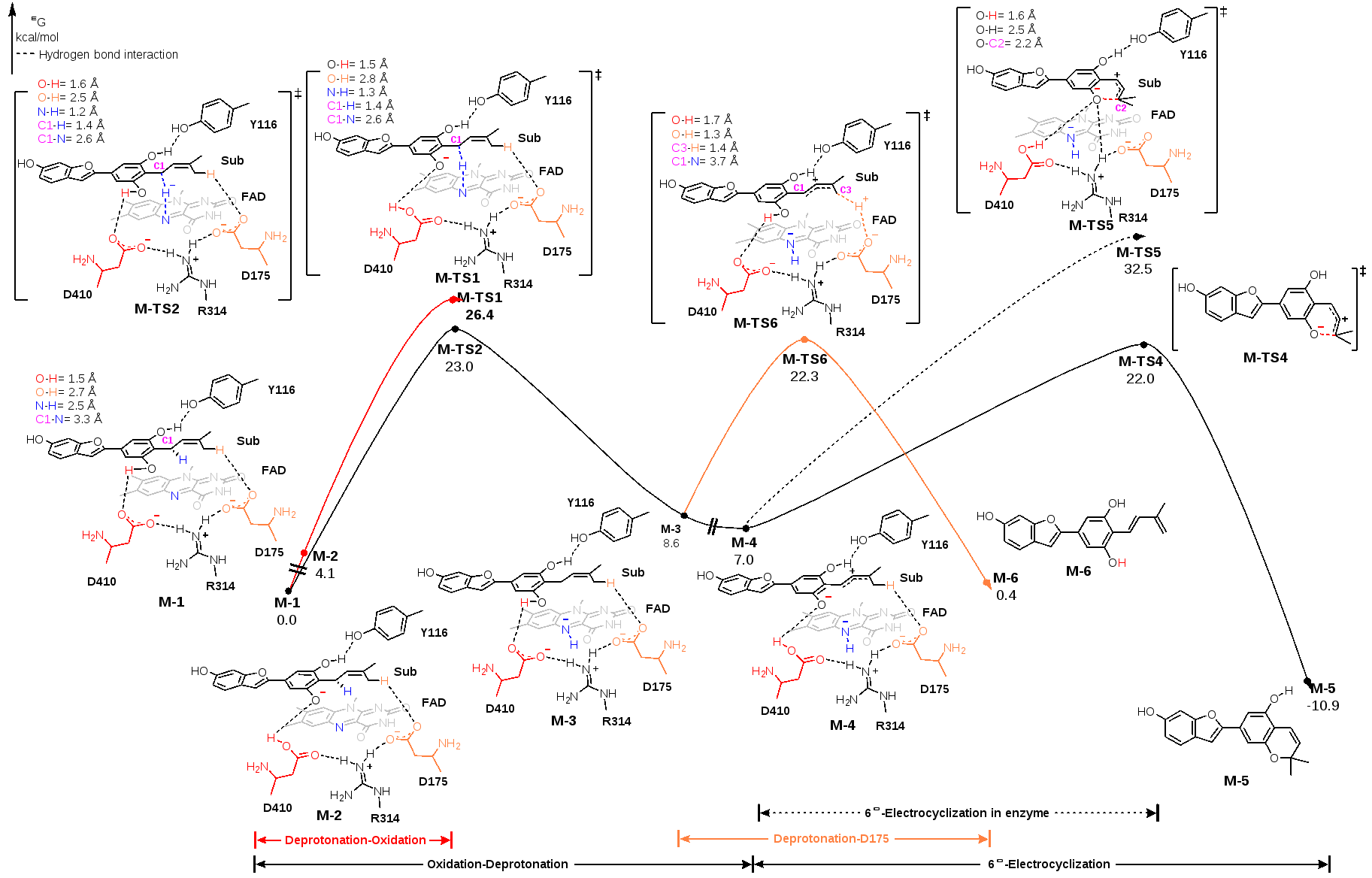 图3. MaDS1催化氧化环化及氧化脱氢反应的DFT计算