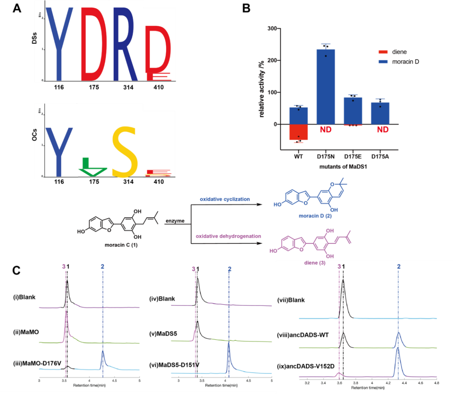 图2. D175是对于氧化环化反应至关重要的氨基酸残基