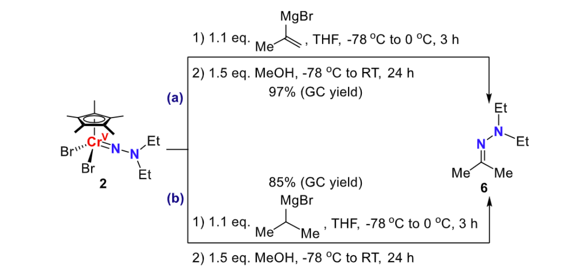 除芳基格氏试剂外,二级烯基格氏试剂(如异丙烯基溴化镁)和二级烷基格氏试剂(如异丙基溴化镁)在低温下也可与配合物2发生复分解反应,加入MeOH后均得到腙类衍生物6(图5)。作者推测,配合物2与异丙烯基溴化镁反应首先得到氮被质子化的烯胺,在溶液中发生互变异构得到腙类衍生物6;而与异丙基溴化镁反应后,在MeOH的促进下,异丙基迁移后会发生β-H消除反应,同样得到腙衍生物6。