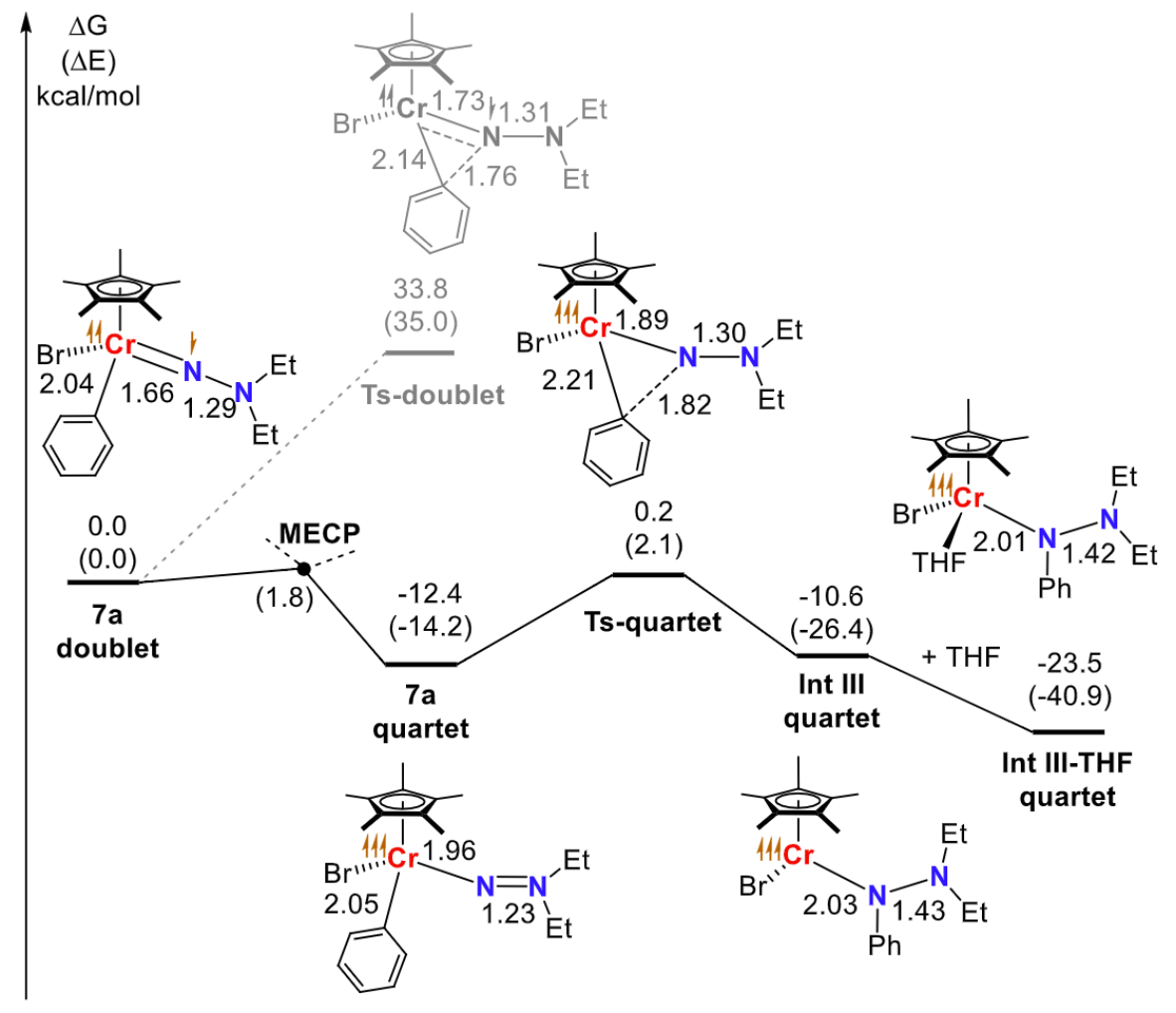 作者通过DFT计算揭示了苯基迁移的可能路径(图8),实验测得配合物7a的Evans磁化率为1.7±0.1 μB,证明其在室温下是低自旋态,而最终得到的Cr(III)配合物是高自旋态,说明反应过程中铬的自旋态发生了转变。计算表明,低自旋的二重态7a发生苯基迁移需要较高能垒(33.8 kcal/mol),只有经过最小能量交叉点转变成四重态7a之后,才有可能在室温下发生苯基迁移。原位监测显示,随着反应进行,反应液的Evans磁化率持续上升,证明了反应过程中低自旋物种向高自旋态的转变。此外,原位UV-Vis光谱进一步佐证了苯基迁移过程。