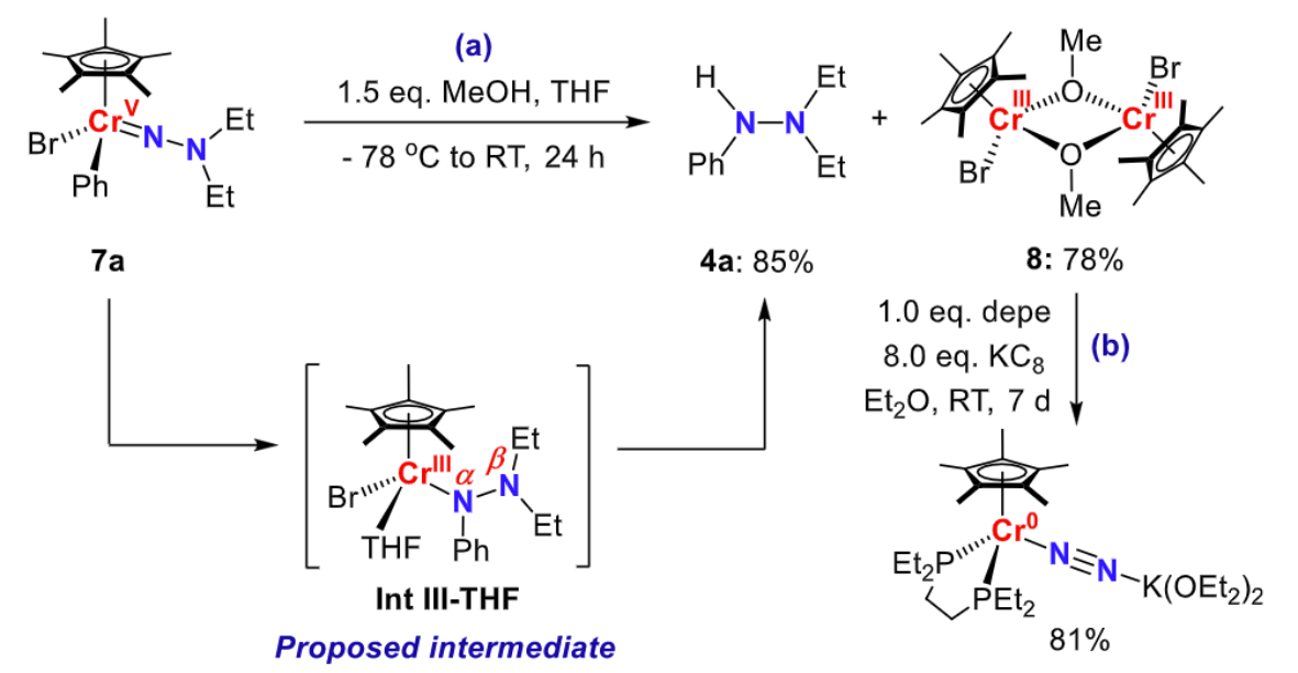 反应结束后,除了分离得到多取代肼,研究人员还从体系中回收到了Cr(III)二聚体配合物8。该配合物在氮气氛围中加入双膦配体depe和还原剂KC8后可以重新生成铬的氮气配合物,完成整个合成循环(图7)。配合物1转化到配合物2过程中生成的季鏻盐3与LiAlH4反应可再生双膦配体depe,实现双磷配体的回收利用。