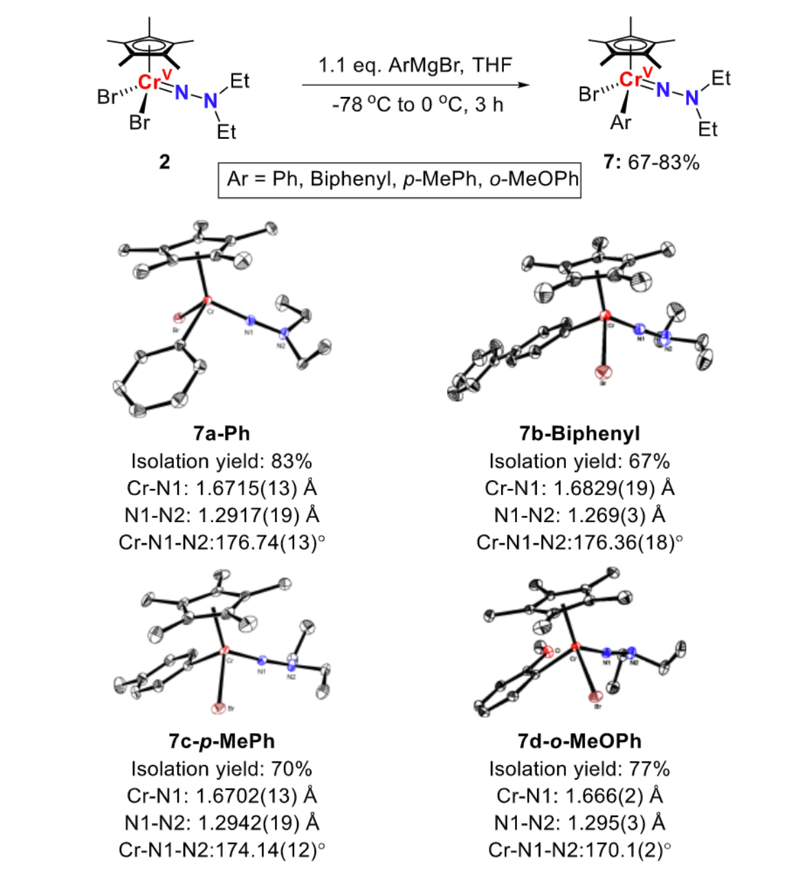 研究人员在严格控制低温的条件下,成功分离了配合物2与芳基格氏试剂发生一次复分解反应得到的中间体,并通过单晶衍射确定其结构(图4)。利用这些中间体与亲电试剂反应,只有邻位含甲氧基取代的配合物7d没有得到相应产物,推测可能是氧原子改变了配位环境,导芳基从铬到氮的迁移无法进行。