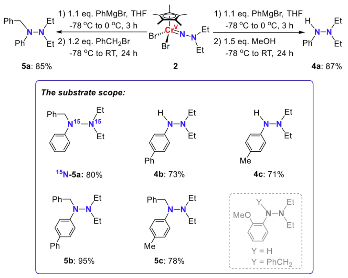 通过原位UV-Vis光谱辅助反应条件优化,如图3所示,配合物2在-78℃下加入1.1当量PhMgBr,升温至0℃反应3 h后加入亲电试剂MeOH或PhCH2Br,可以高收率得到三取代肼4a或四取代肼5a。当使用对位含甲基或苯基取代的芳基格式试剂时,仍可以高收率得到多取代肼产物;当芳基格氏试剂的邻位存在甲氧基配位时,则不能得到芳基迁移产物。