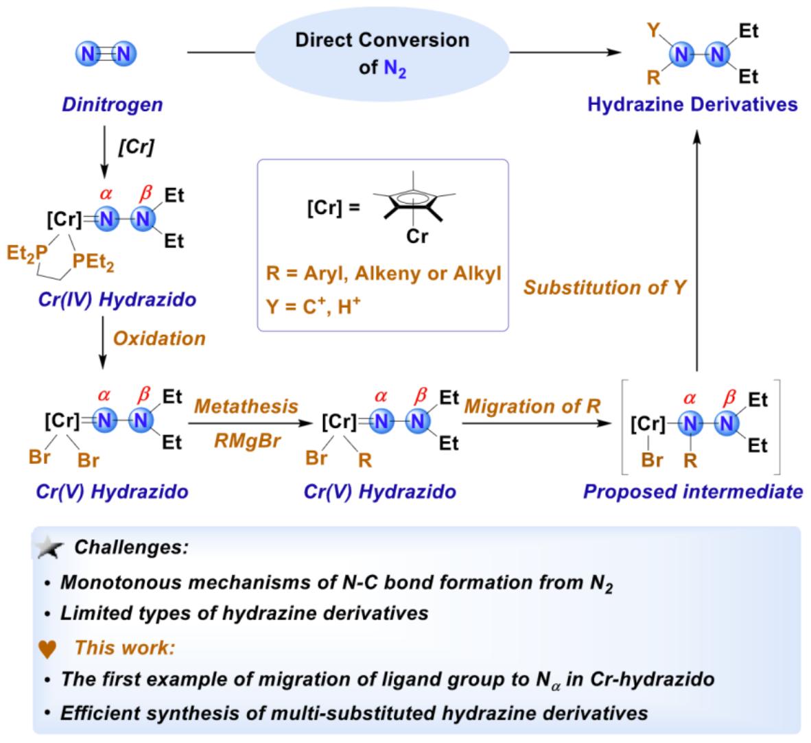 目前,多取代肼的合成主要依赖于苯胺及其重氮盐,后者具有爆炸风险,不仅带来安全隐患,还伴随着高能耗和大量固体废弃物的产生。3003新葡官方网站席振峰/魏俊年团队基于对铬-氮气配合物衍生化的持续深入研究(J. Am. Chem. Soc. 2019, 141, 4241; J. Am. Chem. Soc.2023, 145, 7065; J. Am. Chem. Soc.2023, 145, 9746; Inorg. Chem.2023, 62, 18641; Acc. Chem. Res.2023, 56, 3211; Angew. Chem. Int. Ed.2024, 63, e202315386; Nat. Commun.2025, 16, 674; Inorg. Chem.2025, 64, 17666),报道了一种直接从氮气合成多取代肼衍生物的新方法。该方法通过精准调控亚肼基铬配合物的价态和配位环境,促使碳负离子经Cr="N中间体发生迁移,在C–N键的形成中发挥关键作用(图1)。