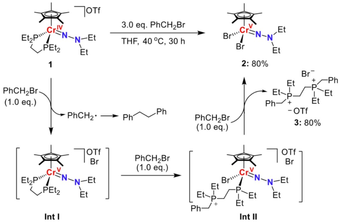 以双膦配体depe配位的亚肼基Cr(IV)配合物1为起始物,该化合物由氮气配合物[Cp*(depe)Cr0NN]K(OEt2)2在低温下与2当量亲电试剂EtOTf反应制得。通过优化反应条件,配合物1在40 ℃下与3当量PhCH2Br反应,可以得到二溴化亚肼基Cr(V)配合物2(图2),其中1当量PhCH2Br作为氧化剂,将铬中心从四价氧化至五价,同时生成的苄基自由基迅速发生偶联;另外2当量PhCH2Br作为亲电试剂与双膦配体depe反应,得到季鏻盐3。通过多次重结晶可以得到较纯的配合物2,该配合物通过X射线单晶衍射、变温磁化率、Evans磁化率、红外光谱(与15N标记产物对照)、元素分析等手段进行表征。结果表明,配合物2中N1−N2键键长为1.277(9)Å,Cr−N1键键长为1.686(6)Å,Cr−N1−N2键键角为173.8(6)°;室温下分子自旋S = 1/2,铬中心有1个单电子。