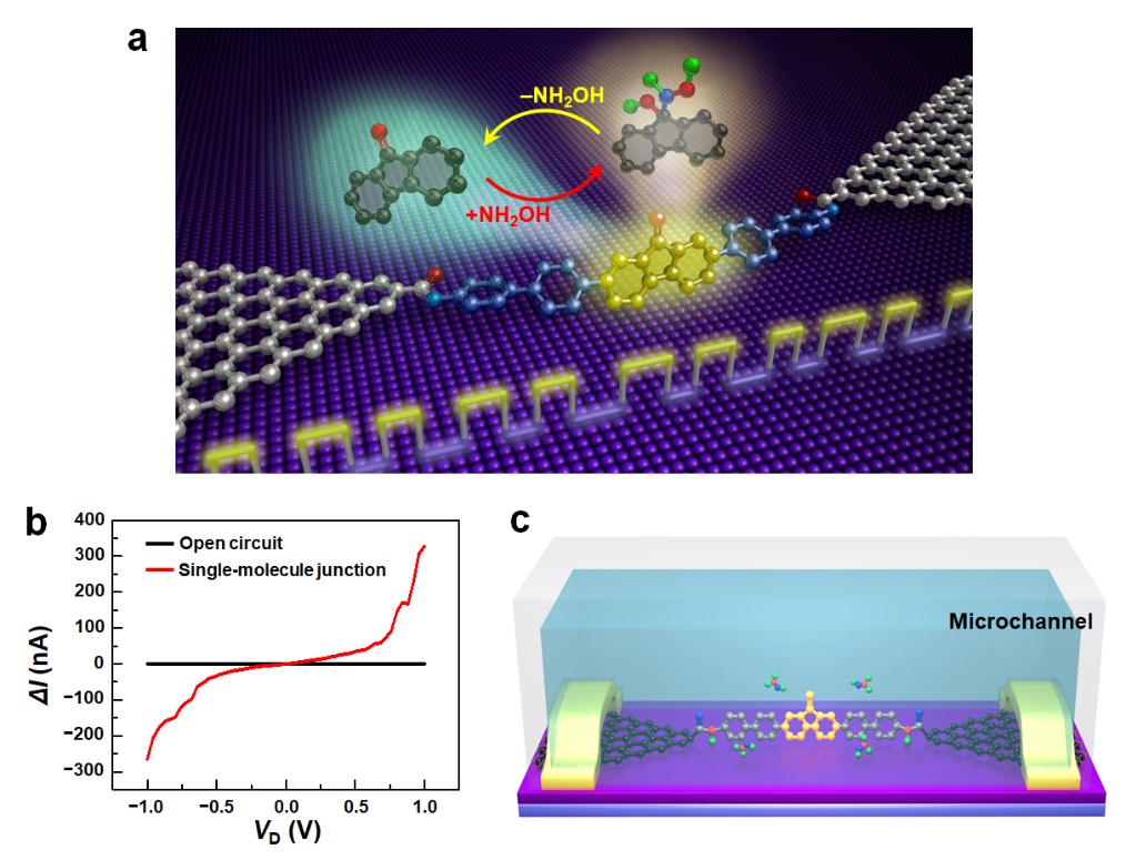 化学反应动力学在基础研究和实际应用中都占有十分重要的地位,通过化学反应动力学的研究不仅可以揭示化学反应的内在机理,而且能够对于化学反应进行有效调控,对于合成和化工生产具有实际意义。然而长久以来,由于化学反应速度快、机理复杂,许多化学反应过程仍然尚不明确,亟待研究。最近,3003新葡官方网站郭雪峰课题组、中科院化学研究所张德清课题组以及加利福尼亚大学洛杉矶分校Kendall N. Houk课题组合作发展了一种基于单分子器件平台的单分子电学检测新方法和新技术,实现了在单分子水平上对于化学反应动力学的研究。