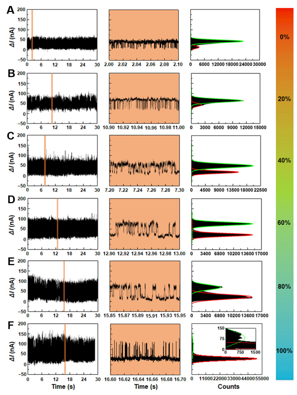 溶剂依赖性实验:0%(A)20%(B)40%(C)60%D)80%(E)100%(F)乙醇中I-t曲线及相应双稳态统计分布