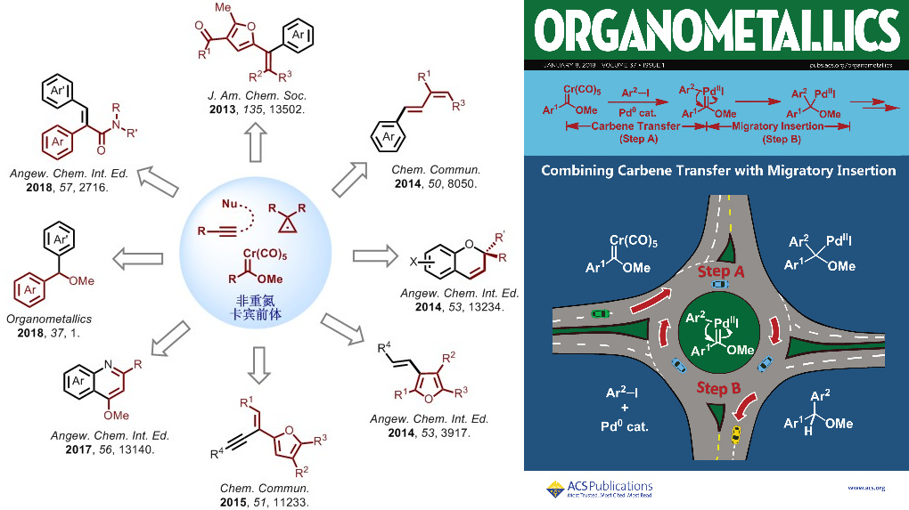Fischer卡宾是经典的稳定金属卡宾络合物,自1964Fischer等首次报道以来经过几十年的发展已经成为一类非常重要的有机金属化合物。利用卡宾配体在不同金属之间的转移,课题组发展了一系列钯催化的Fischer铬卡宾交叉偶联反应。例如,他们发展了钯催化的芳基铬卡宾与芳基碘化物的还原偶联反应,通过一系列机理验证实验和DFT理论计算,对该反应的机理进行了深入的探讨,验证了卡宾转移以及钯卡宾的迁移插入为催化循环中的关键步骤Palladium-Catalyzed Reductive Cross-Coupling Reaction of Aryl Chromium(0) Fischer Carbene Complexes with Aryl Iodides. Kang Wang, Yu Lu, Fangdong Hu, Jinghui Yang, Yan Zhang, Zhi-Xiang Wang, and Jianbo Wang, Organometallics 2018, 37, 1)(被选为封面论文)。