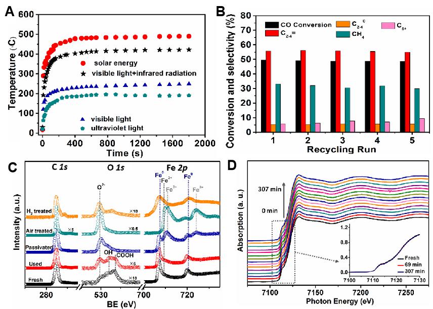 图2.(A)在不同波段光照条件下Fe5C2催化剂床层的温度;(B)Fe5C2催化剂的循环稳定性测试;(C)催化剂经过不同条件前处理后的准原位XPS谱图;(D)在光照条件下,催化剂中Fe K-边随反应时间变化的原位XANES谱图。