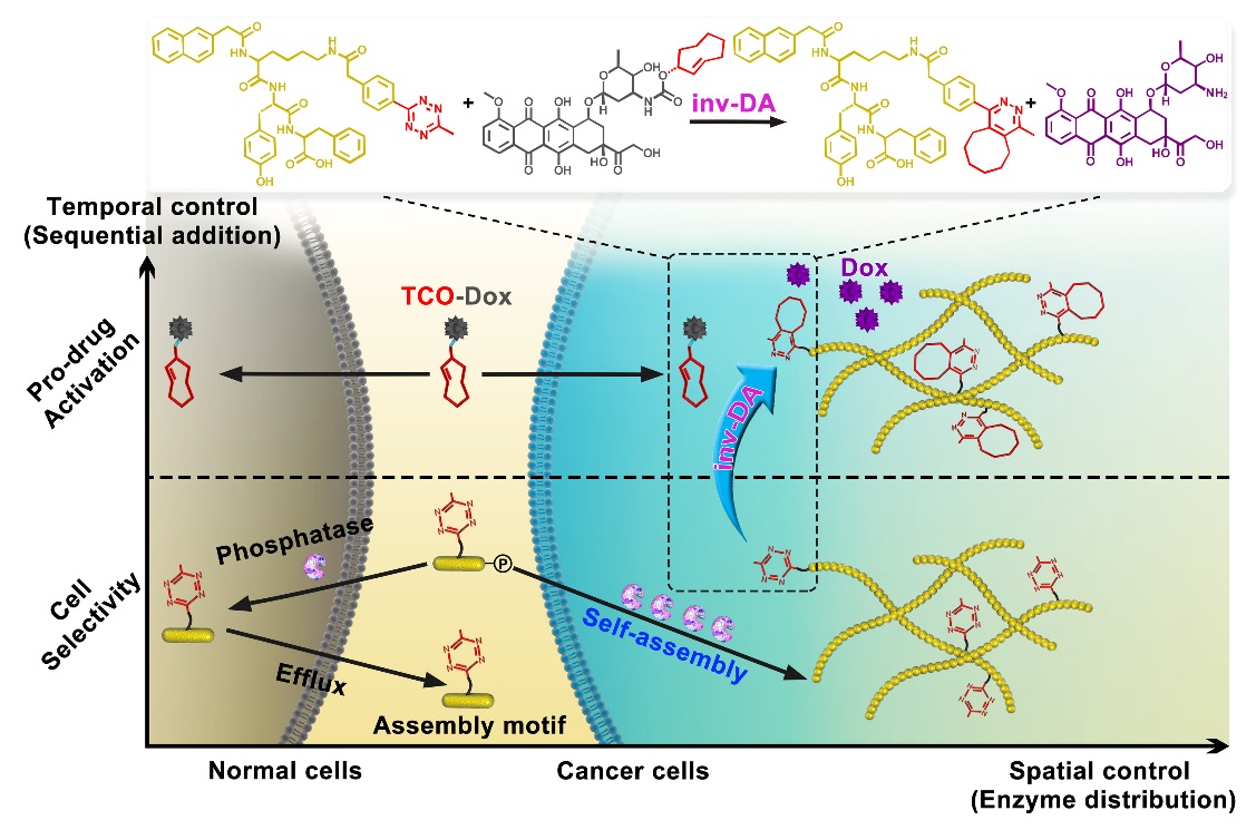 图1. 协同利用酶触发的超分子自组装和生物正交断键反应,实现肿瘤细胞特异的前药激活。