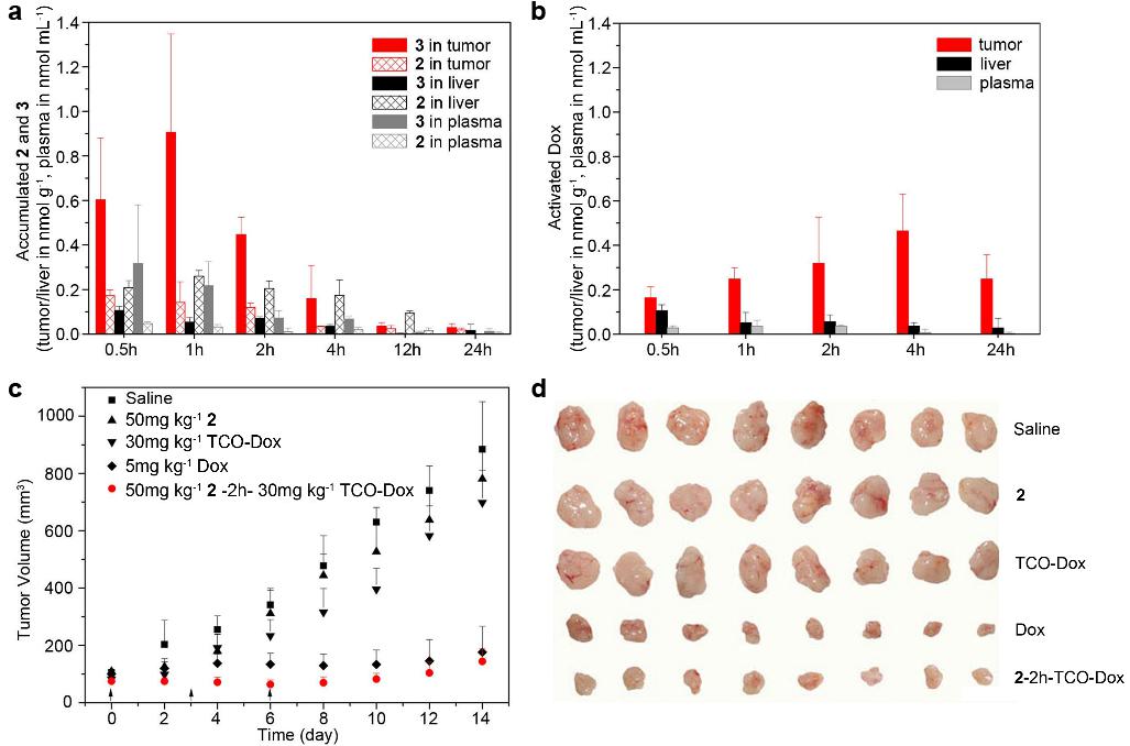 动物模型研究进一步证明Tetrazine开关能够选择性富集在肿瘤组织内,并特异激活前药释放阿霉素,使得肿瘤组织内阿霉素浓度显著高于肝脏等正常组织。肿瘤治疗实验表明,自组装与生物正交反应的协同效应,能够显著抑制肿瘤生长,并具有良好的生物安全性(图3)。