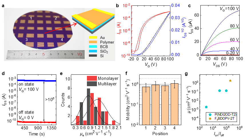 图2 聚合物单分子层场效应晶体管的器件性能表征。