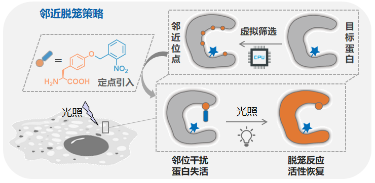 为了解决这一瓶颈问题,陈鹏课题组与王初课题组合作提出了“邻近脱笼”的新策略。通过向蛋白质活性中心附近引入一种带有光保护基团的非天然酪氨酸(ONBY), 可同样实现对其活性的远程干扰和抑制;随后通过“光脱笼”反应将保护基团移除,使其活性重新恢复。由于在蛋白质活性口袋附近插入ONBY后能够通过影响蛋白稳定性、底物结合等多种因素调控蛋白质活性,该策略将原有的“活性位点脱笼”转变为“活性口袋脱笼”,极大地扩展了该方法的适用范围。