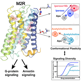 M2毒蕈碱型乙酰胆碱受体(M2R)是一个典型的GPCR,在调节人体心率和许多中枢神经系统功能中发挥重要作用,是研究GPCR 信号转导、调节以及药物设计的模式受体。该项研究通过在M2R中引入13CH3-ε-甲硫氨酸同位素标记探针,检测受体在结合一系列配体小分子时的核磁图谱变化(图一),分析M2R动态构象变化与这些配体对G蛋白激活和抑制蛋白 (arrestin)招募效应差异的相关性。同时,结合分子动力学模拟实验进一步解释不同配体结合导致受体激活时构象和功能变化差异的分子机制。该项研究首次将M2R的配体结构、受体构象变化以及配体功能多样性联系起来,揭示了M2R信号转导多样性可能的分子机制,并为针对这类重要受体的药物研发提供了理论指导。