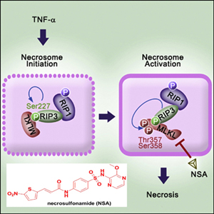 The receptor-interacting serine-threonine kinase 3 (RIP3) is a key signaling molecule in the programmed necrosis (necroptosis) pathway. This pathway plays important roles in a variety of physiological and pathological conditions, including development, tissue damage response, and antiviral immunity. Here, we report the identification of a small molecule called (E)-?N?-(4-(?N?-(3-methoxypyrazin-2-yl)sulfamoyl)phenyl)-3-(5-nitrothiophene-2-yl)acrylamide?-hereafter referred to as necrosulfonamide?-that specifically blocks necrosis downstream of RIP3 activation. An affinity probe derived from necrosulfonamide and coimmunoprecipitation using anti-RIP3 antibodies both identified the mixed lineage kinase domain-like protein (MLKL) as the interacting target. MLKL was phosphorylated by RIP3 at the threonine 357 and serine 358 residues, and these phosphorylation events were critical for necrosis. Treating cells with necrosulfonamide or knocking down MLKL expression arrested necrosis at a specific step at which RIP3 formed discrete punctae in cells. These findings implicate MLKL as a key mediator of necrosis signaling downstream of the kinase RIP3.