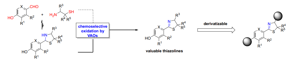 Nitrogen heterocycles are commonly found in bioactive natural products and drugs. However, the biocatalytic tools for nitrogen heterocycle synthesis are limited. Herein, we report the discovery of vanillyl alcohol oxidases (VAOs) as efficient biocatalysts for the one-pot synthesis of 2-aryl thiazolines from various 4-hydroxybenzaldehydes and aminothiols. The wild-type biocatalyst features a broad scope of 4-hydroxybenzaldehydes. Though the scope of aminothiols is limited, it could be improved via semi-rational protein engineering, generating a variant to produce previously inaccessible cysteine-derived bioactive 2-aryl thiazolines using the wild-type VAO. Benefiting from the derivatizable functional groups in the enzymatic products, we further chemically modified these products to expand the chemical space, offering a new chemoenzymatic strategy for the green and efficient synthesis of structurally diverse 2-aryl-thiazoline derivatives to prompt their use in drug discovery and catalysis.
